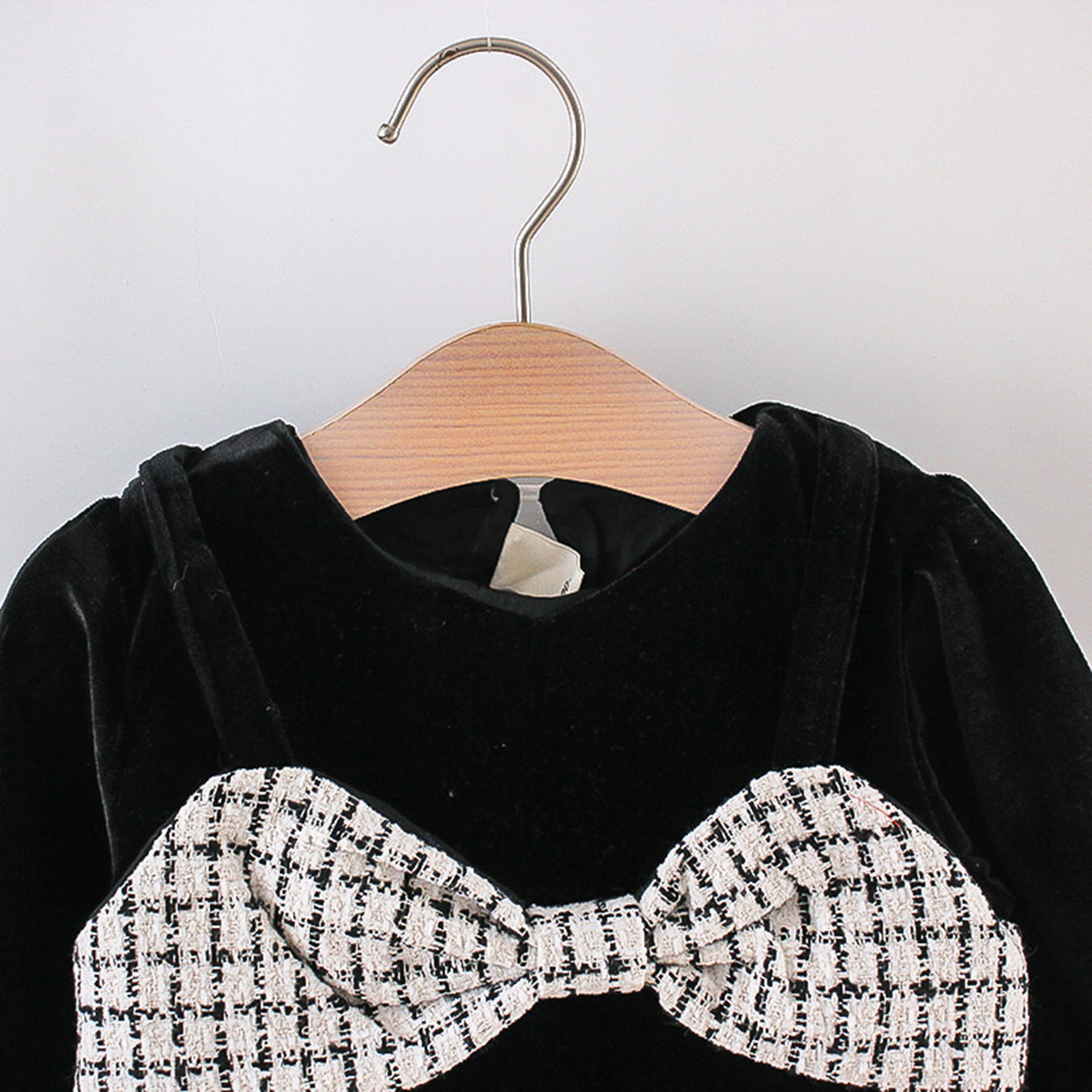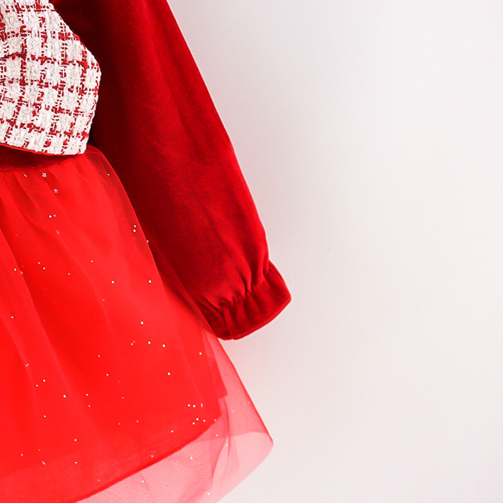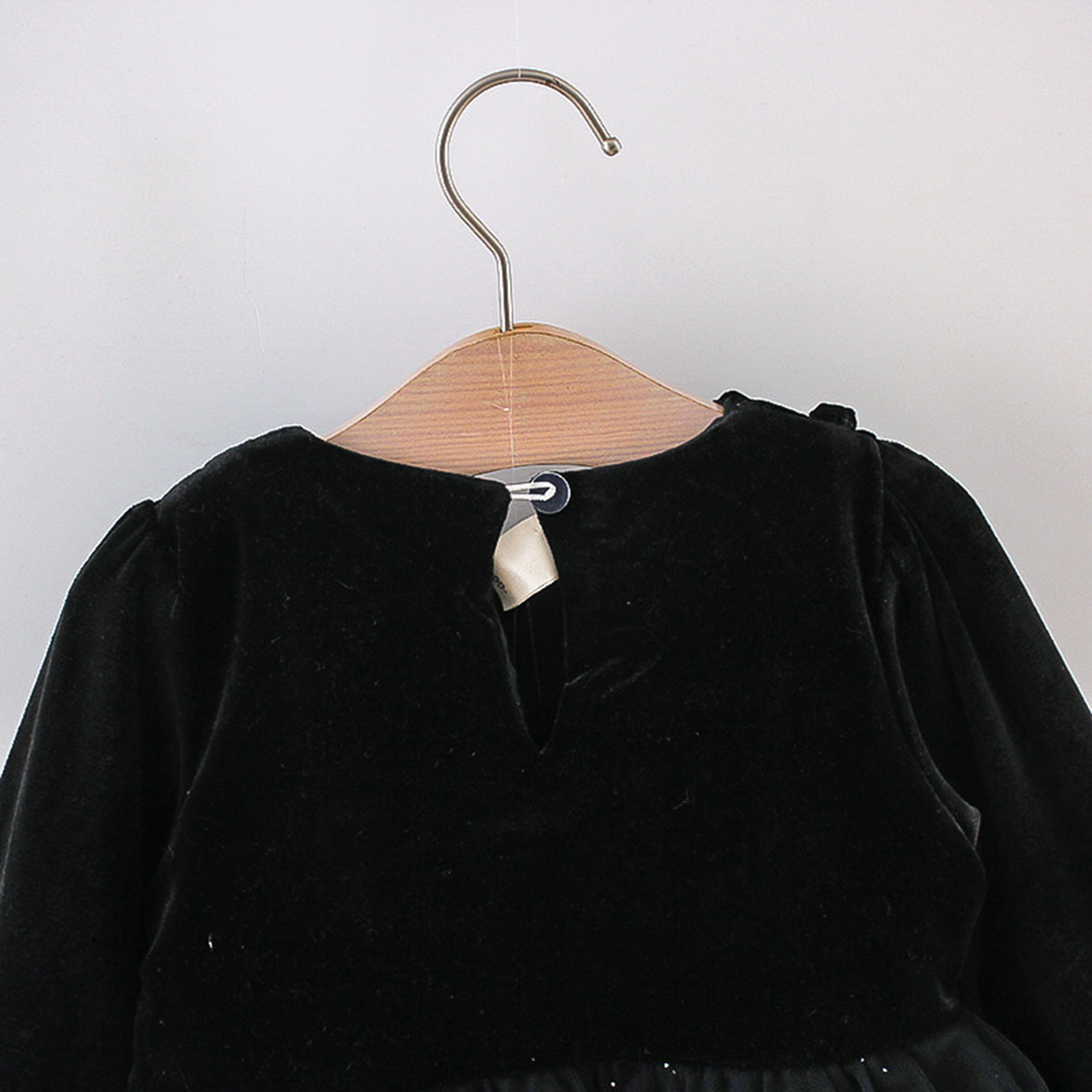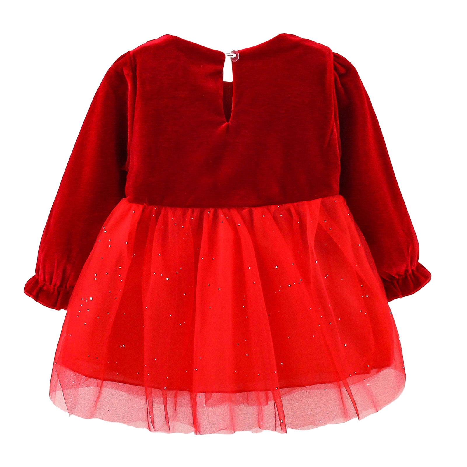 The dress features with long sleeve and ruffle neckline, lace embroidery and bowknot decorated in the front.