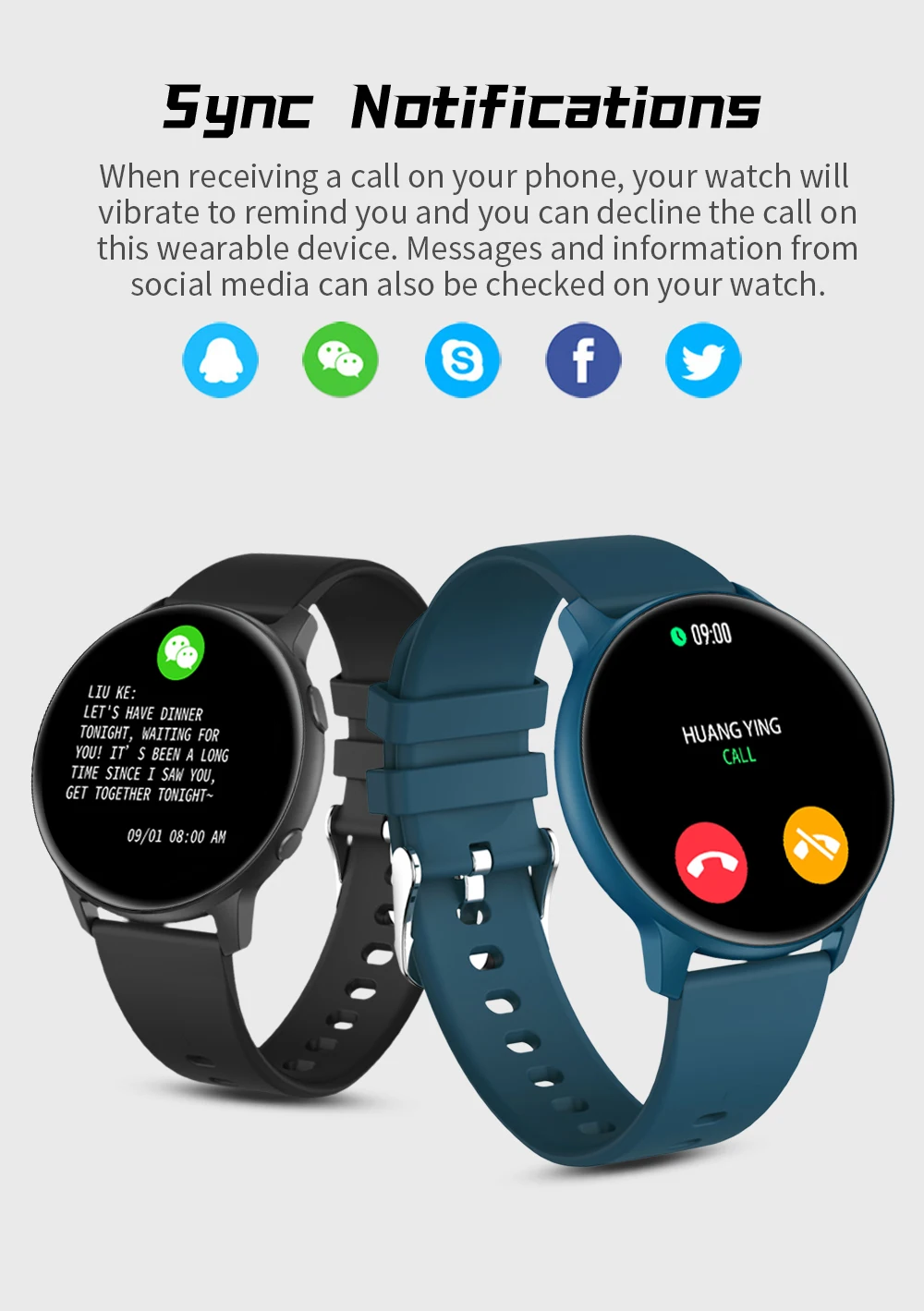 При получении звонка на вашем телефоне ваши часы будут вибрировать, чтобы напомнить вам, и вы можете отклонить вызов на этом носимом устройстве. Сообщения и информация из социальных сетей также могут быть проверены на ваших часах.