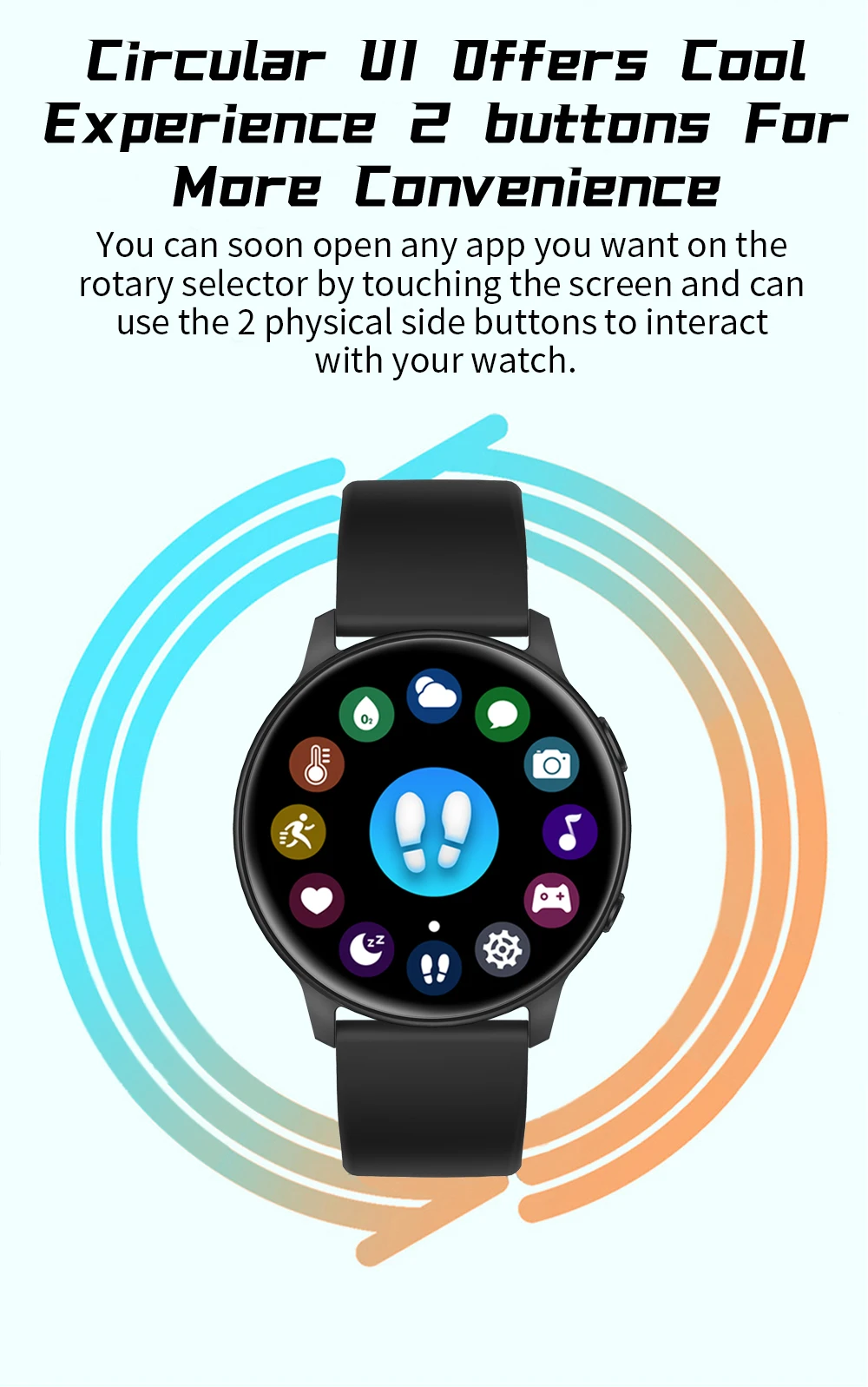 Вы можете быстро открыть любое приложение, которое вы хотите, на поворотном селекторе, прикоснувшись к экрану и используя 2 физические боковые кнопки, чтобы взаимодействовать с Вашими часами.
