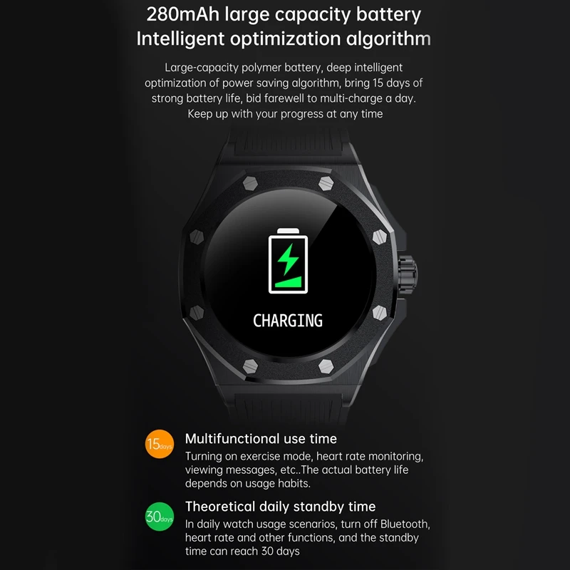 280mAh large-capacity battery, deeply intelligently optimized power saving algorithm and power consumption of various components, bringing 15 days of strong battery life