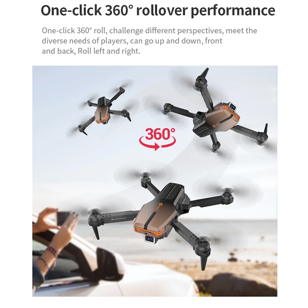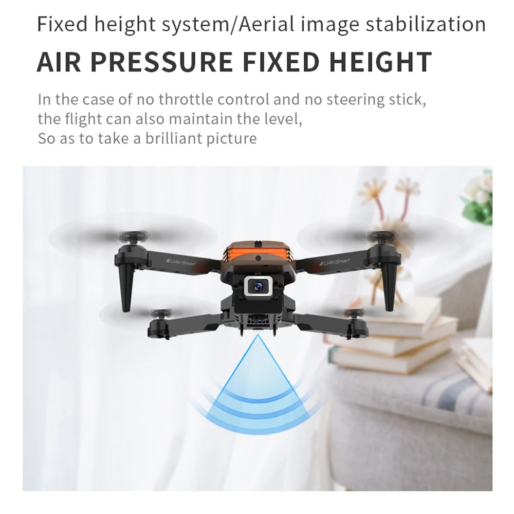 Three-sided infrared obstacle avoidance, fixed height function, foldable aircraft, six pass with gyroscope; one-button take-off, one-button landing, ascent and descend, forward and backward, left and right side fly, steering, headless mode (with camera can add functions: gestures Camera, video, headless mode, emergency stop, trajectory flight, gravity sensor, music, 50x zoom, automatic camera)