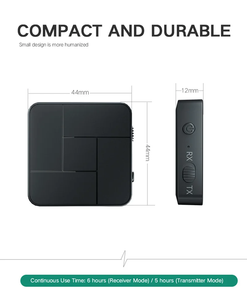 4. Просто нажмите переключатель для переключения между режимами передатчика и приемника. Применение передовые технологии Bluetooth и 3,5 мм аудио кабель (все указанные аккумуляторы входят в комплект поставки), чтобы легко подключиться.
