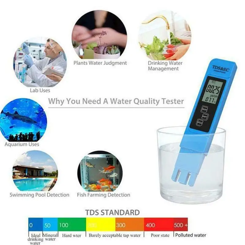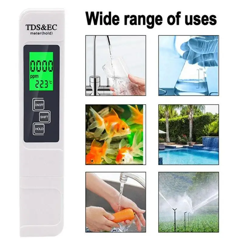Предоставляя точные и надежные показания теста: 3-в-1 цифровой измерительный прибор TDS может точно измерить TDS (всего растворенные вещества), EC (проводимость) и температуры. Профессиональный, точный и точный трехв-1 TDS, EC и измеритель температуры воды. Прибор TDS имеет автоматическую компенсацию температуры в режиме измерения. При отсутствии работы в течение 9 минут счетчик автоматически отключится. Экономия энергии и увеличение срока службы батареи