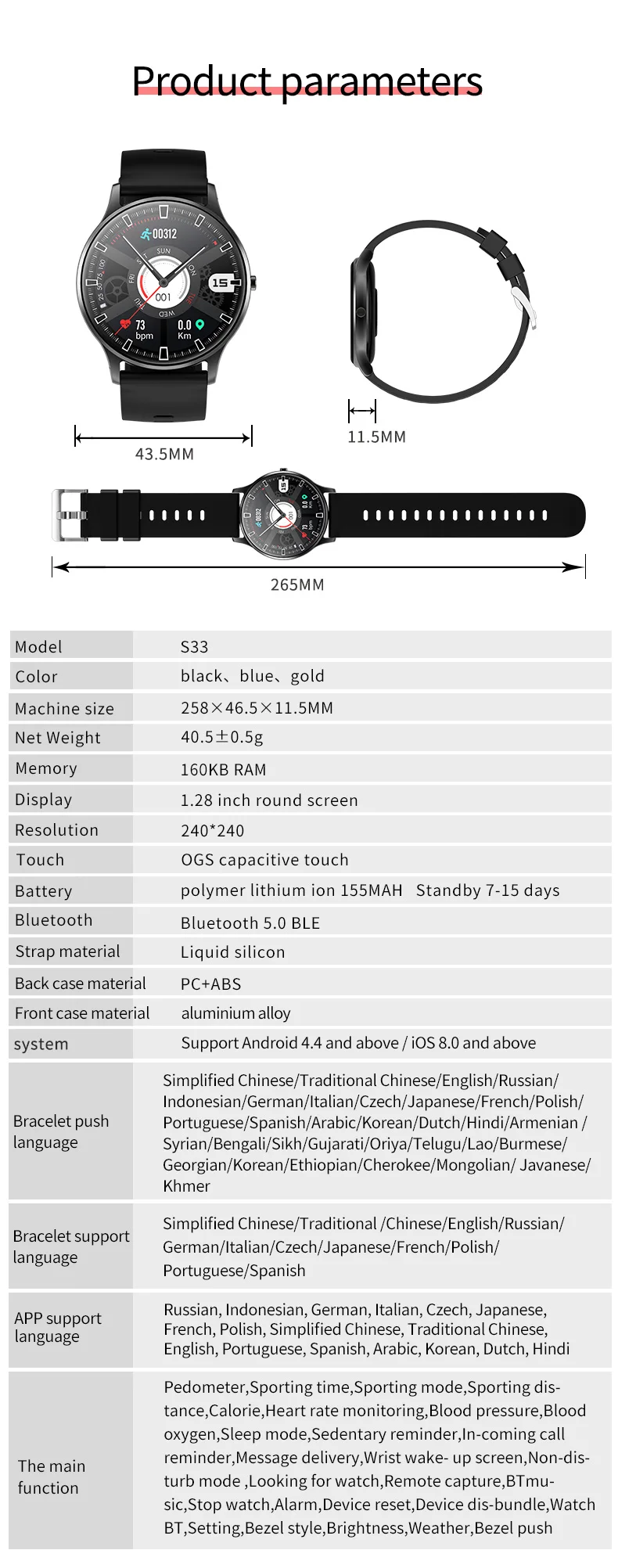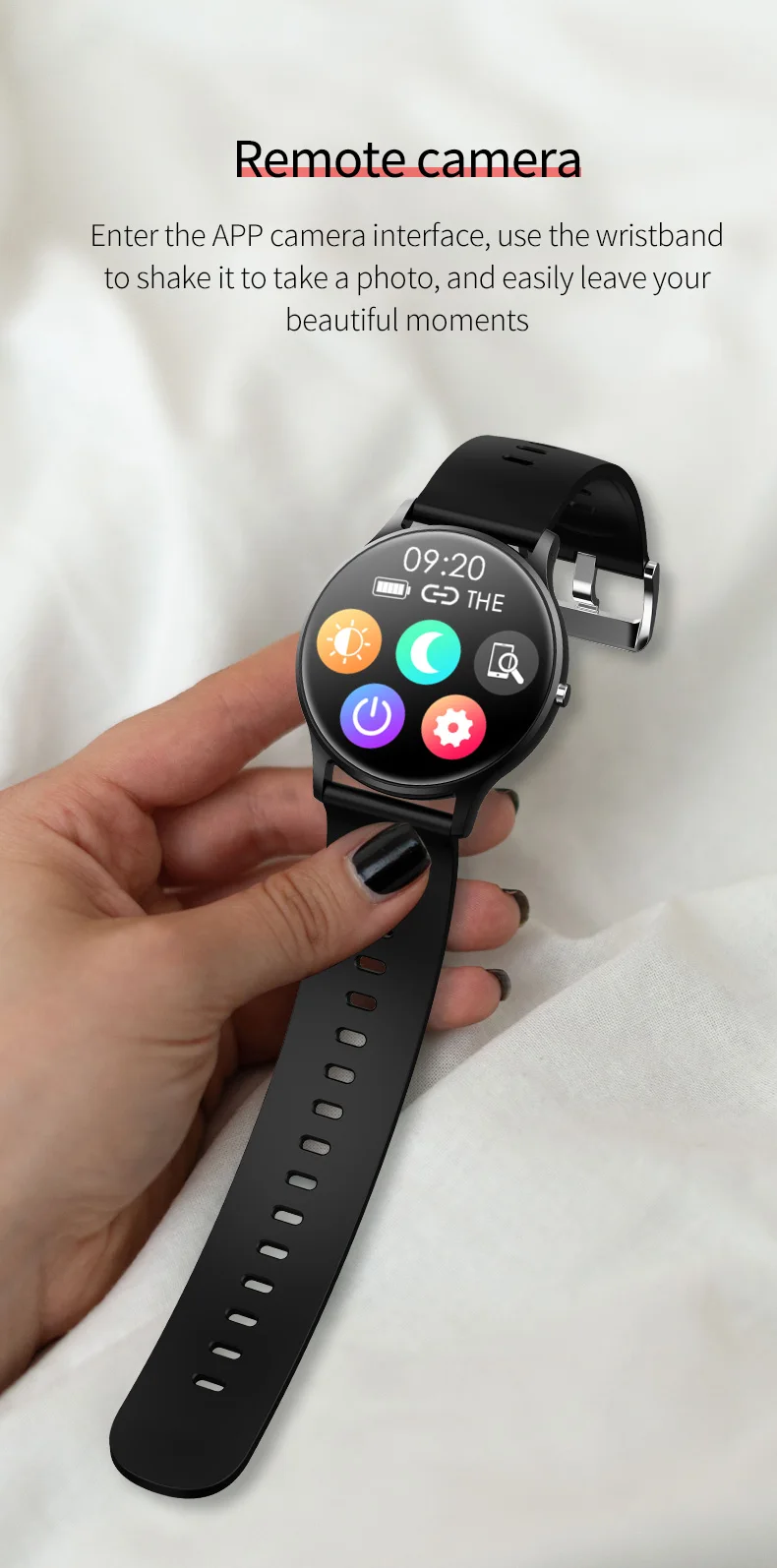 Различные переключение циферблата, удаленная камера, поднимите запястье, чтобы осветить экран, браслет Bluetooth, режим сна, не беспокоить режим, напоминание о сидячем положении, удаленная камера, напоминание о звонках, push сообщения, поиск мобильных телефонов, местной музыки, таймера, будильника, погоды