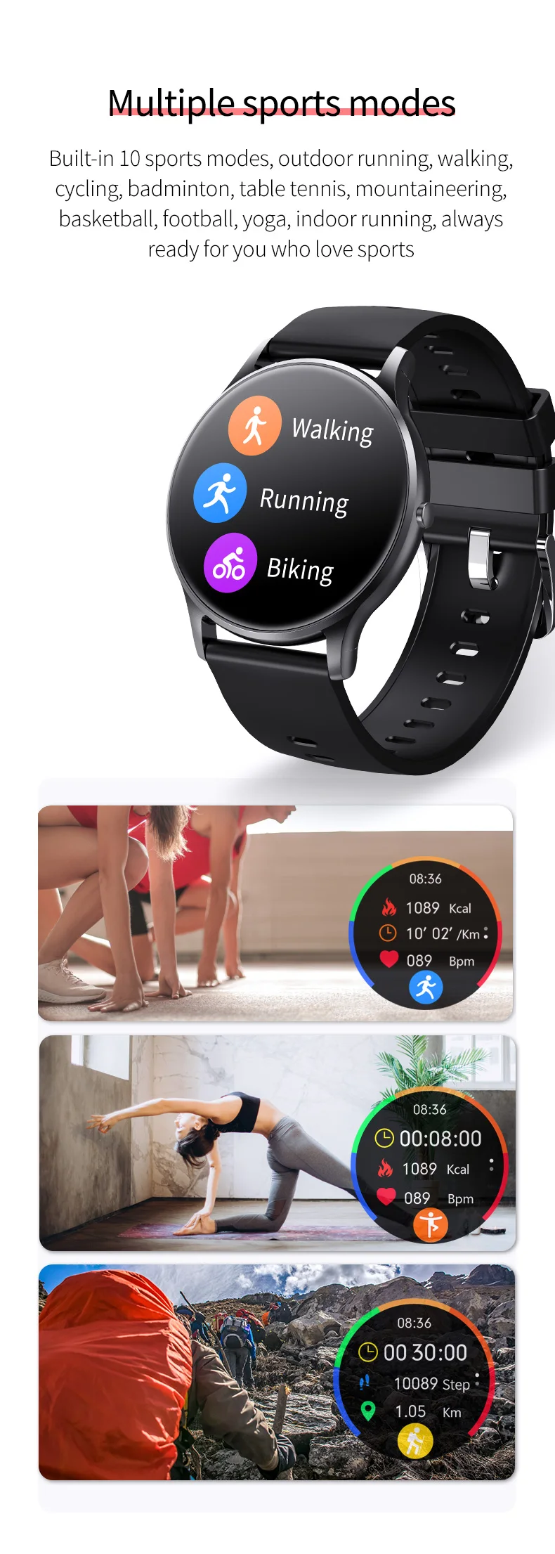 10 спортивных режимов: открытый бег, прогулки, езда на велосипеде, бадминтон, настольный теннис, альпинизм, баскетбол, футбол, Йога, бег в помещении