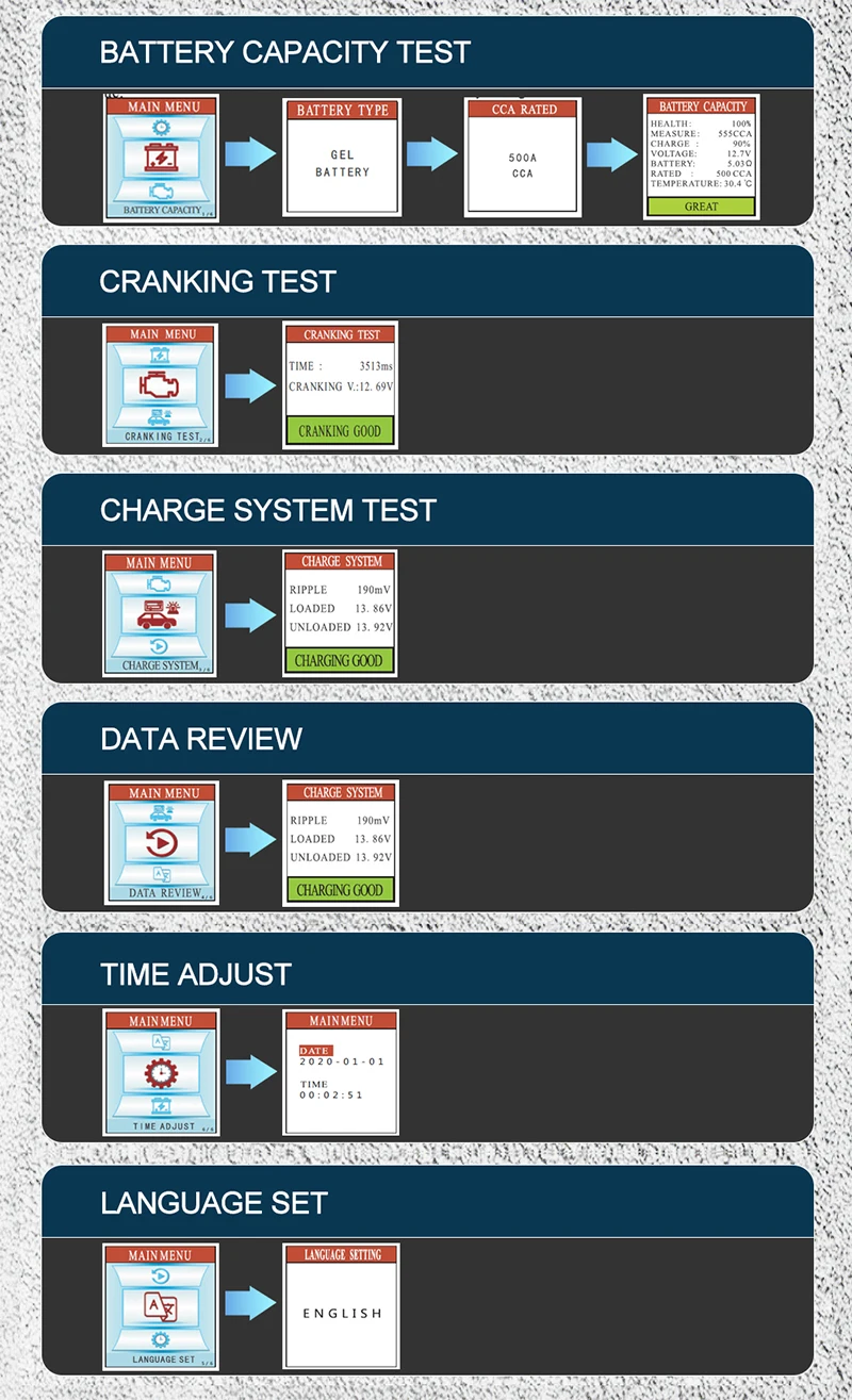 Это обязательный инструмент в области продаж аккумуляторов, ремонта автомобилей и системы оборудования для проверки батареи.