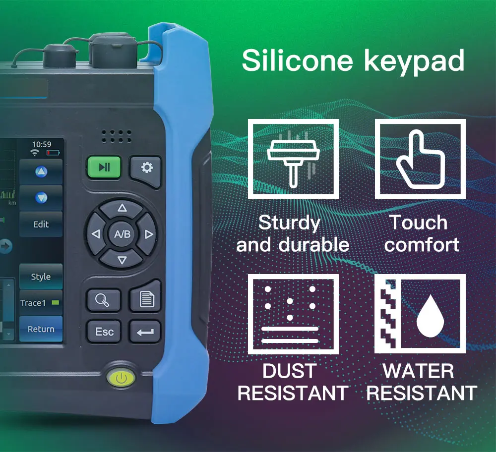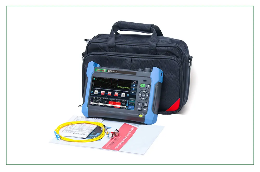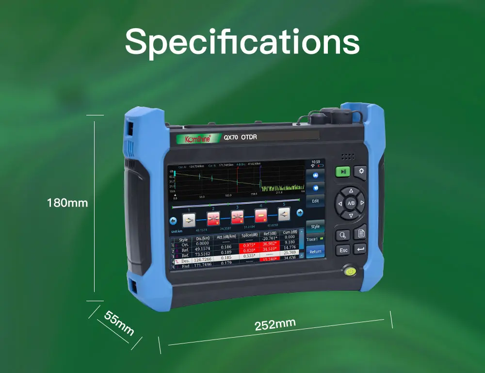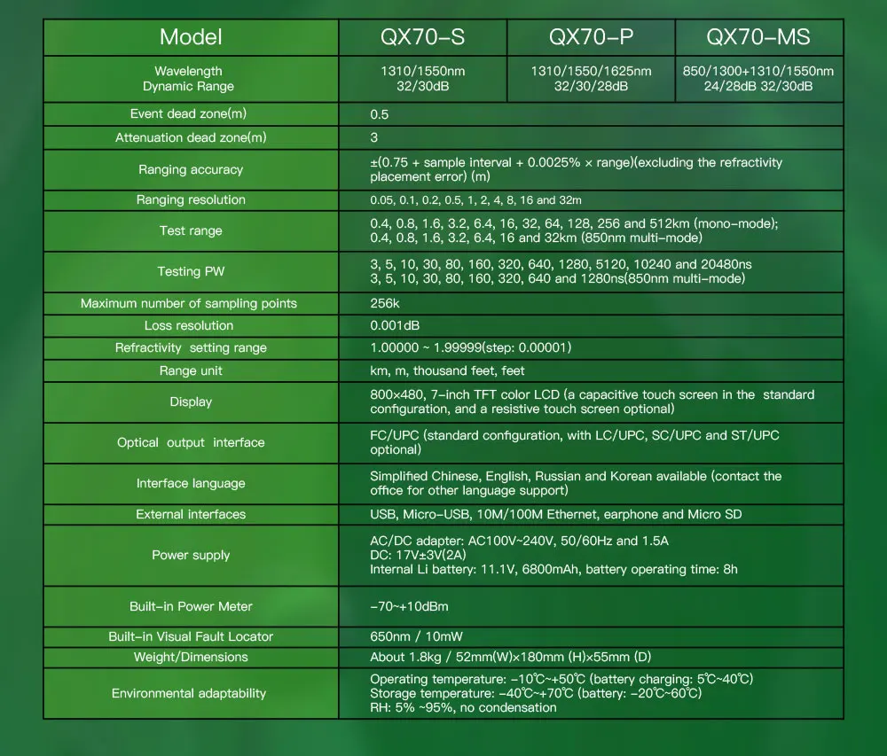 Примечание: с коротким рукавом 0,5 м мертвые зоны в QX70 предназначен для FTTx приложения. Он может проверить длину, потерю соединителя волокна и другие физические характеристики волокна. Он может точно найти события на оптоволоконных кабелях. Это действительно инструмент для установки и обслуживания приложений FTTx, а также для НИОКР и тестирования волокон. QX70 прочный дизайн, легкий и простой в эксплуатации, а также ЖК-дисплей с низким отражением и срок службы батареи более 10 часов делают его идеальным в тестировании. Между тем, два интерфейса USB и SD помогают хранить и передавать следы легко и удобно. ..