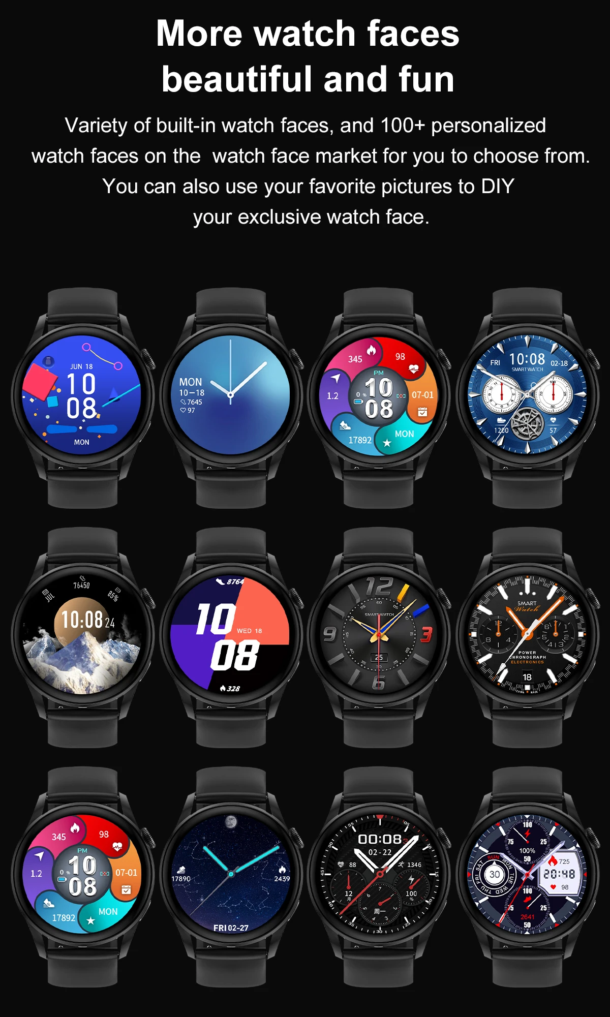 Разнообразие встроенных циферблатов часов и более 100 персонализированных циферблатов часов на рынке циферблатов для вас на выбор. Вы также можете использовать свои любимые фотографии, чтобы сделать своими руками свое эксклюзивное лицо часов.