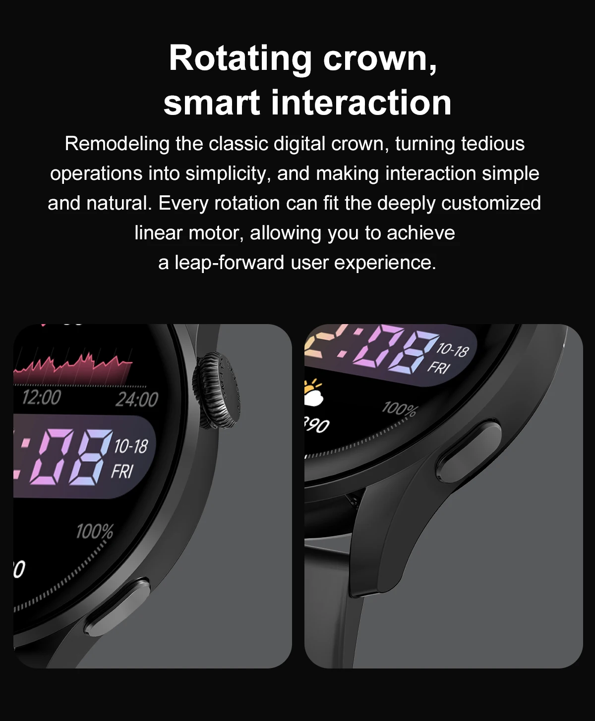 Реконструкция классической цифровой короны, превращая утомительные операции в простоту и делая взаимодействие простым и естественным. Каждое вращение может соответствовать глубоко настроенному двигателю inear, что позволяет вам достичь Скачка Вперед пользовательского опыта.