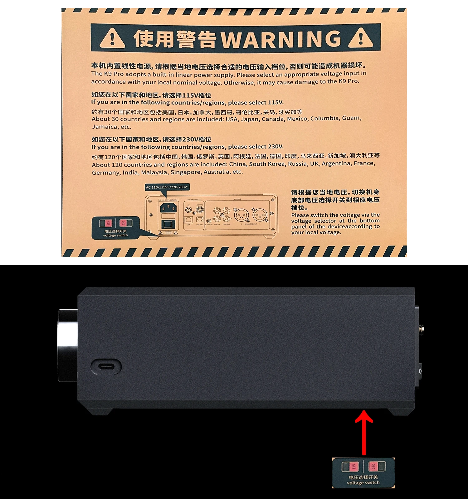 Пожалуйста, переключите напряжение с помощью селектора напряжения в нижней части (под базой, а не задней) панели устройства в соответствии с вашим местным напряжением.