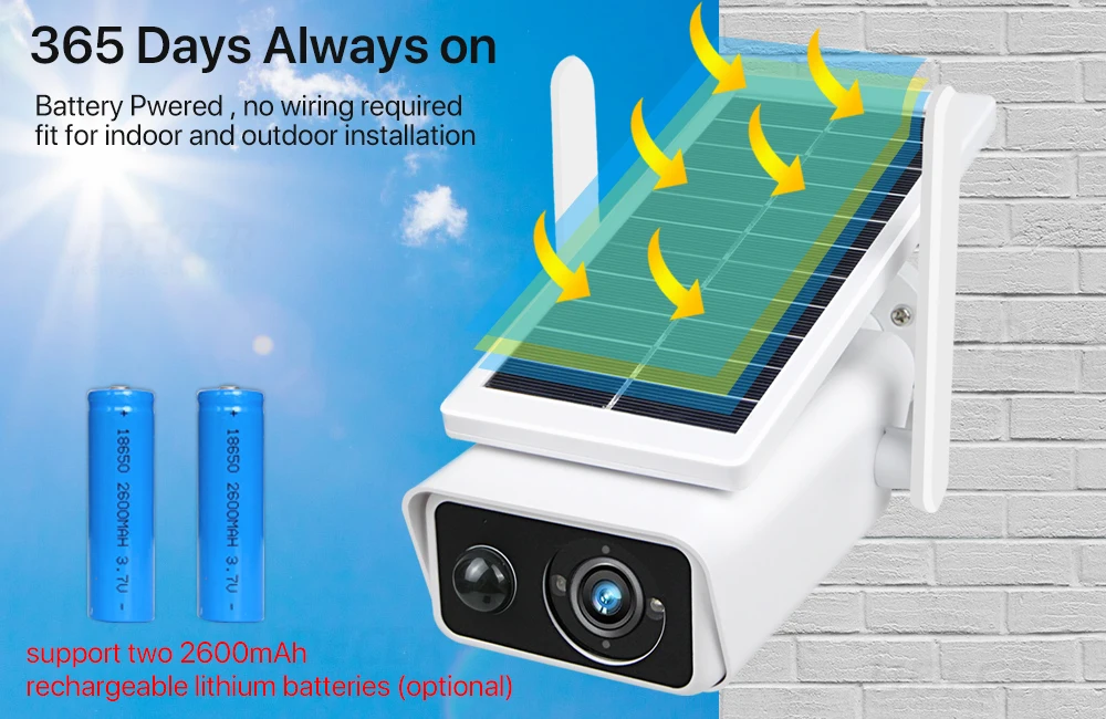 -Вашу камеру апллид с аккумуляторной батареи, которая заряжается от солнечных панелей, В тех случаях, когда камера подключена к панели солнечных батарей, а также она попадет в режиме нон-стоп питания в течение всего дня всю ночь. Его можно заряжать даже в дождливые дни