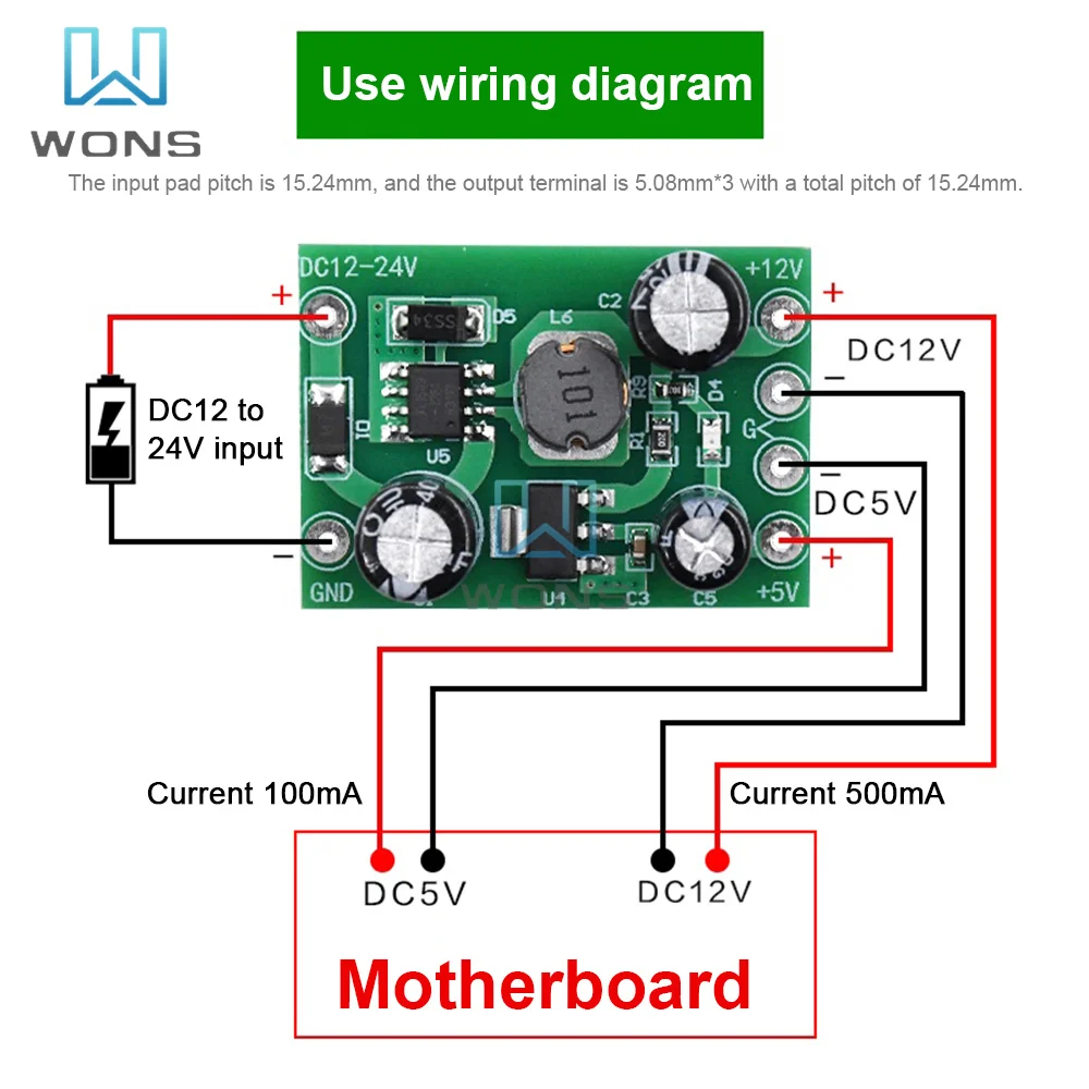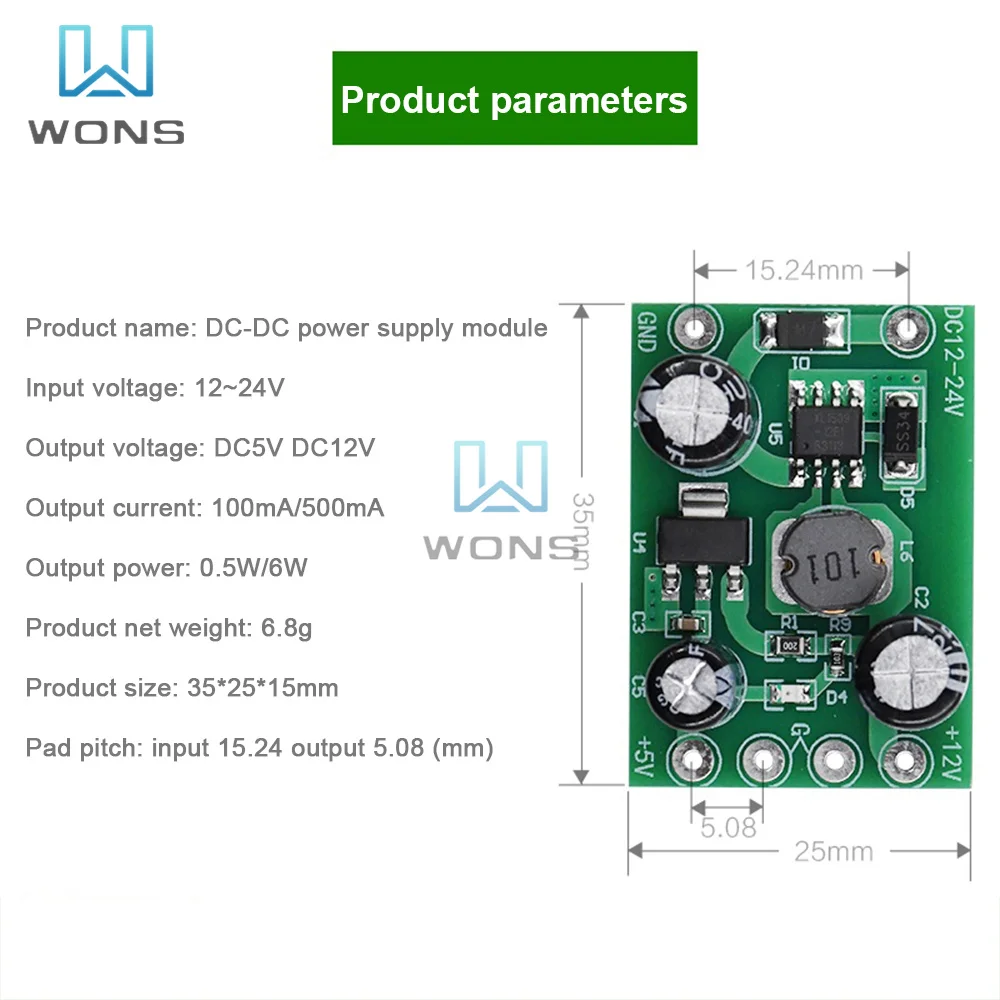 Этот продукт представляет собой модуль питания постоянного тока с широким входом мощности, двойным выходом и другими характеристиками; Входное напряжение DC12 ~ 24 В, двойной выход DC5V и DC12V, максимальный выходной ток 100mA/500mA, максимальная мощность составляет 0,5 Вт 6 Вт; Вход и выход соединены подушечкой и может использоваться Прямая поставка от производителя И может также использоваться с штыревыми головками для сварки с другими монтажными платами.