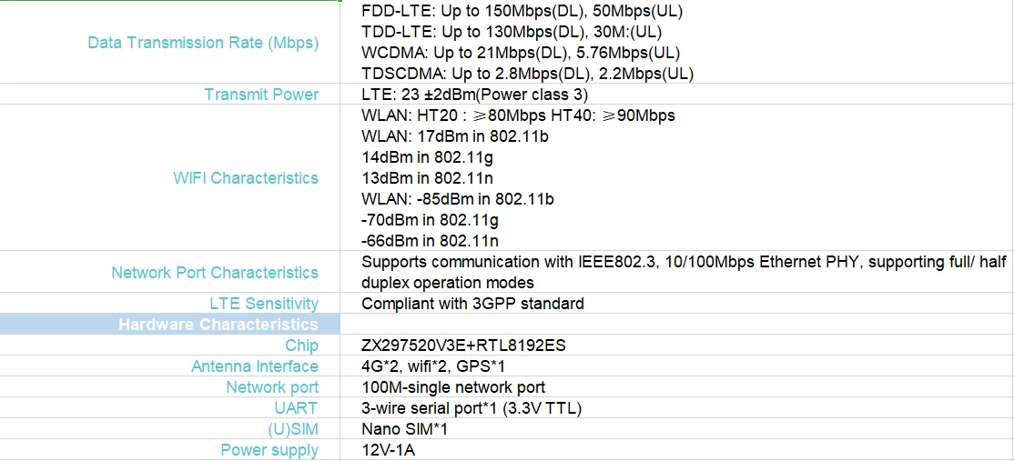 LTE sensitivity complies with 3GPP standard, weight is about 30g