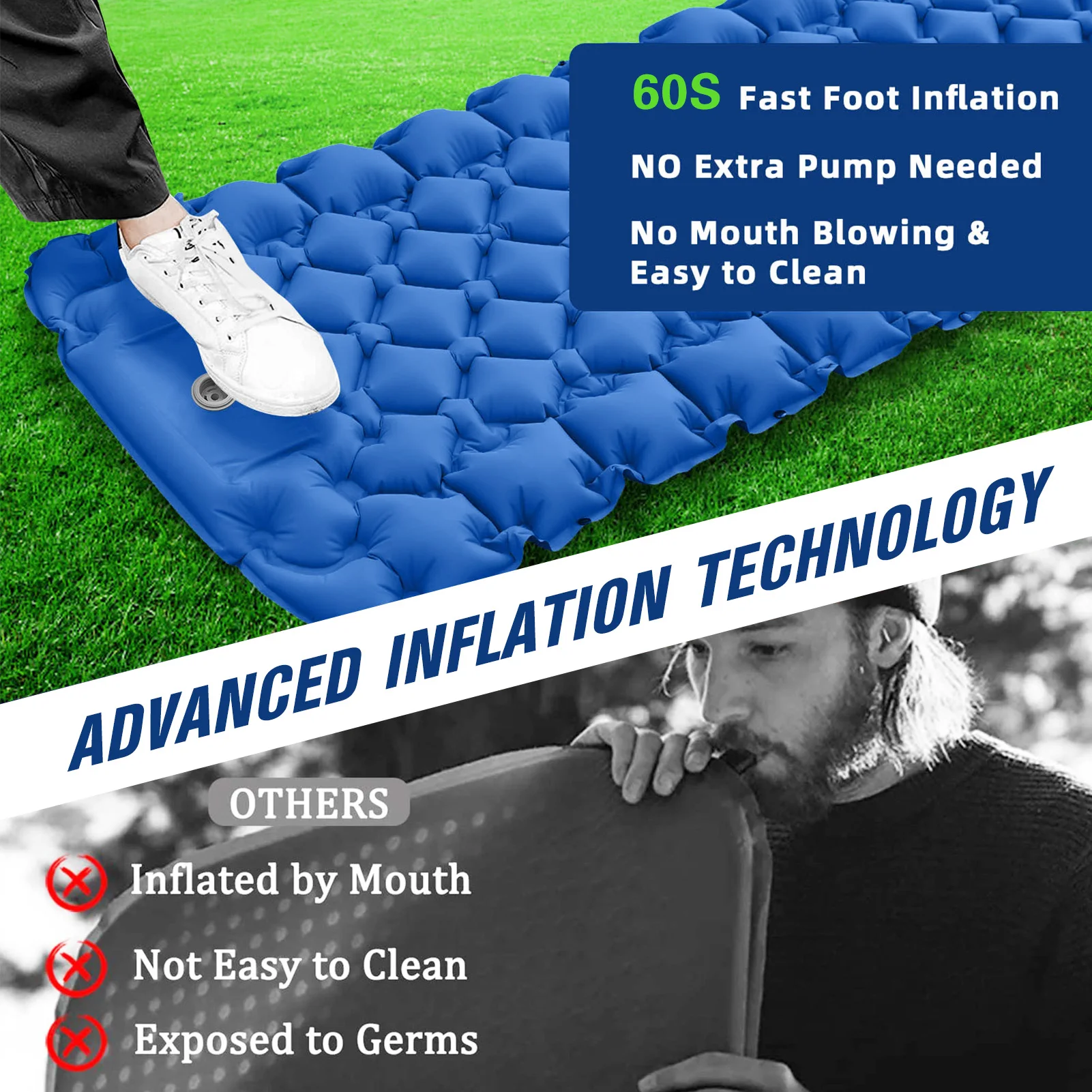 Насос не нужен. Быстро надуть воздушный матрас ногой. Откройте дефляционный клапан, чтобы быстро сдуть.