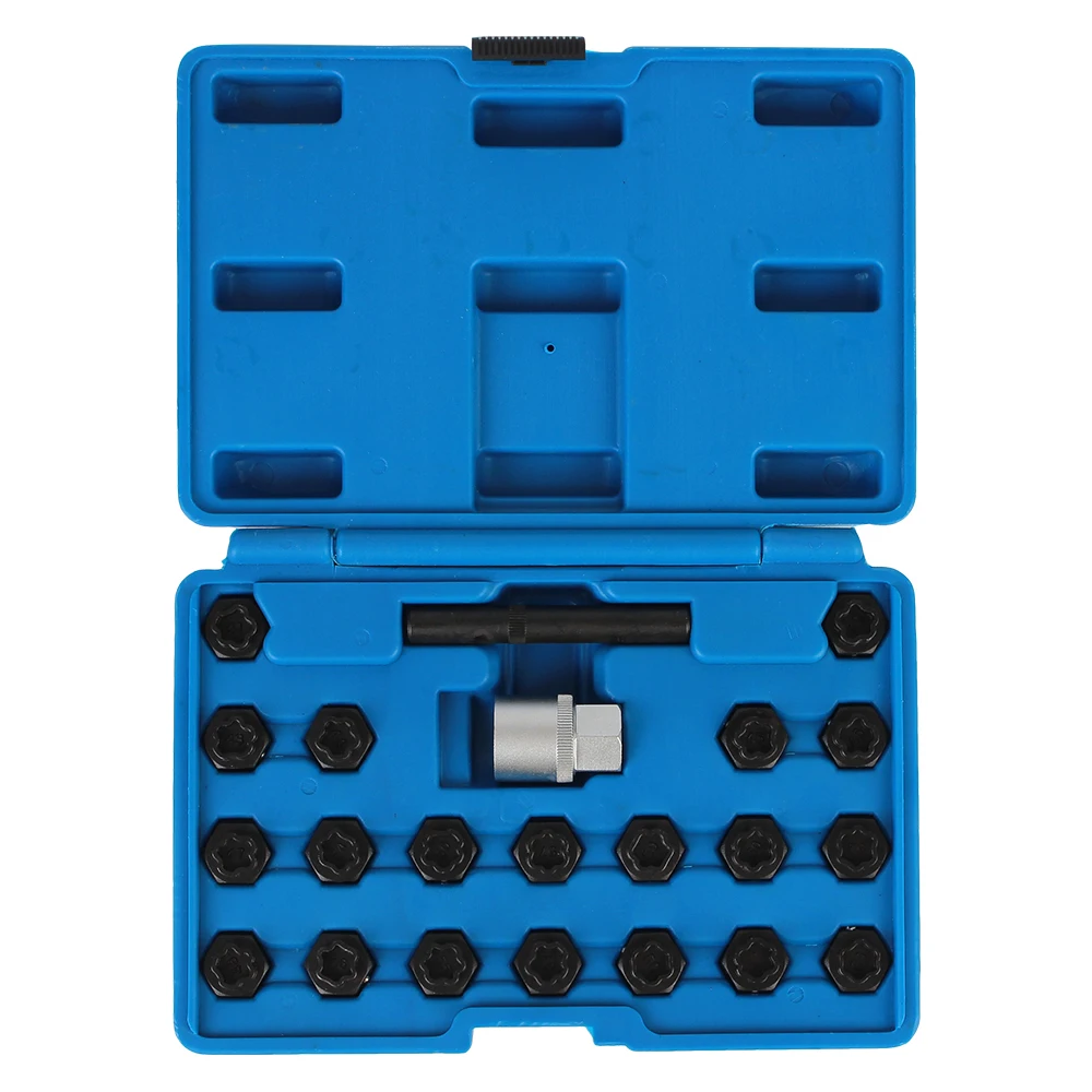 Посылка включает в себя 20 различных фасонных клавиш, 1/2 дюйма квадратная и 21 мм Шестигранная розетка, 1 шт. 90 мм удлинитель. Идеально используется для удаления и блокировки большинства серий гаек для колес BMW.