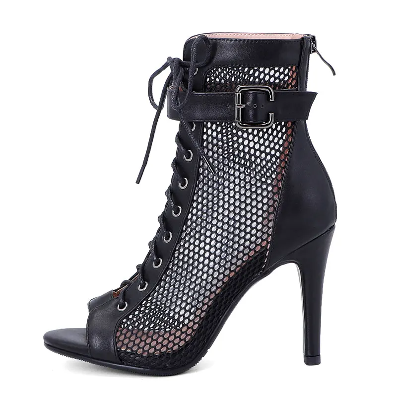 Красивые женские сетчатые ботинки для латинских танцев на каблуке; Женские летние короткие ботинки; Ажурные кружевные ботинки с открытым носком на тонком высоком каблуке; Маленькие размеры