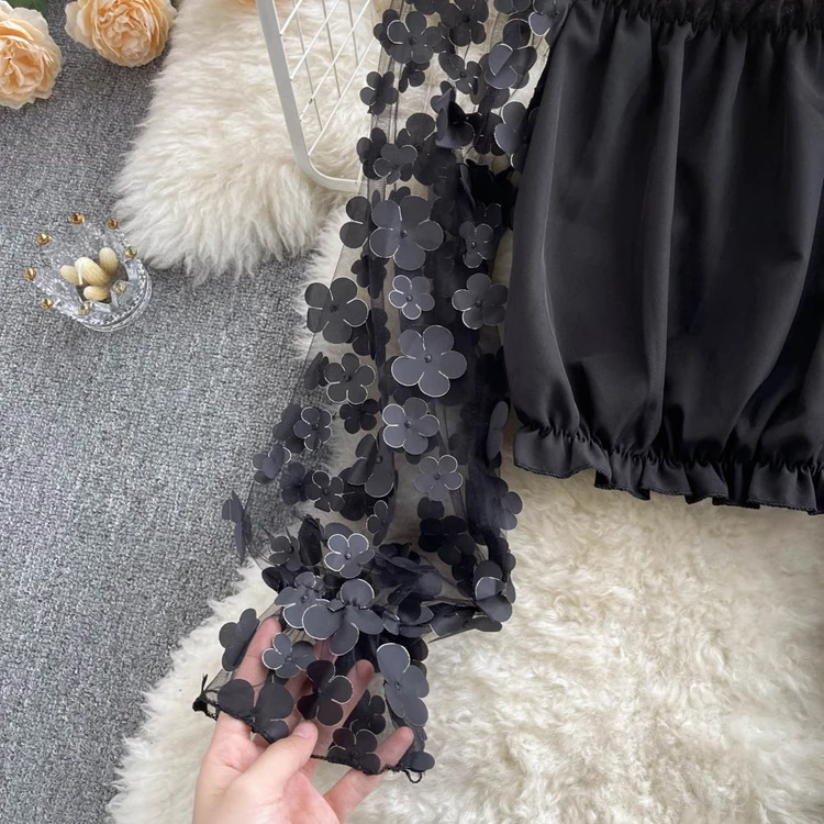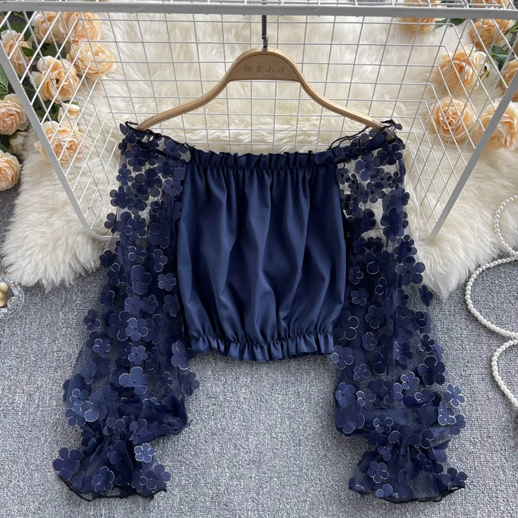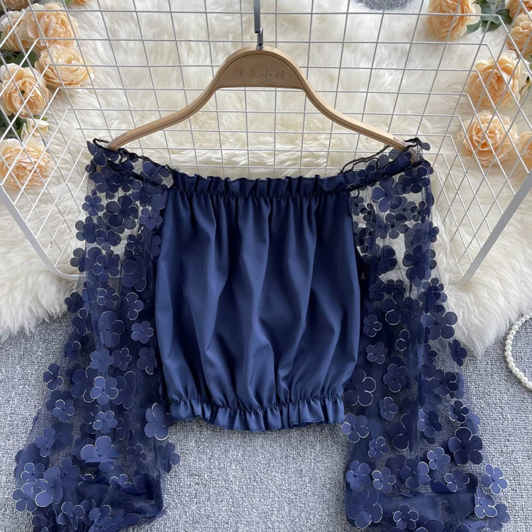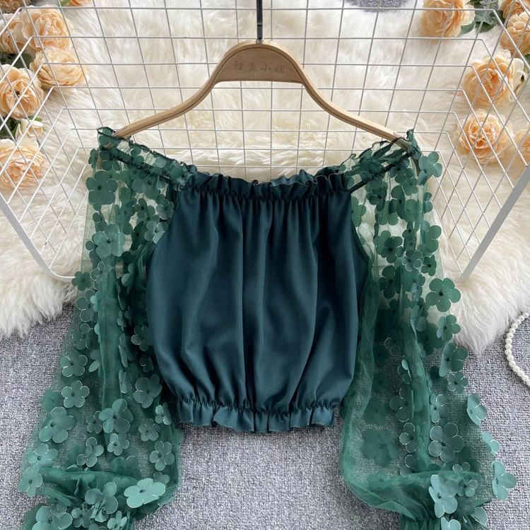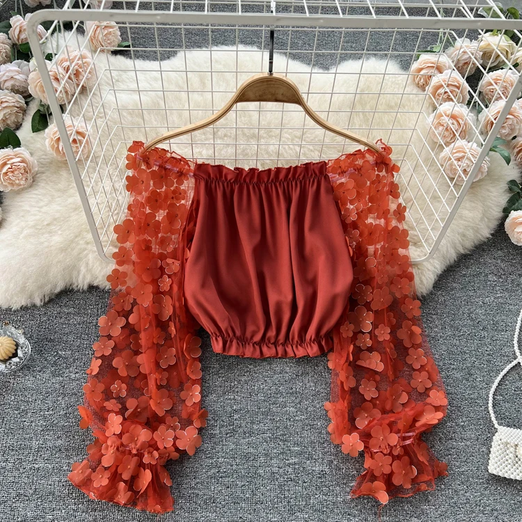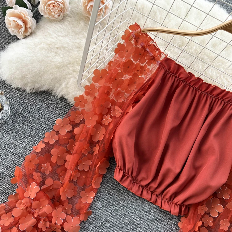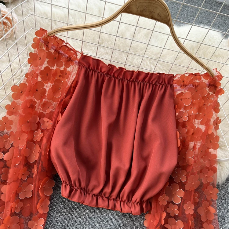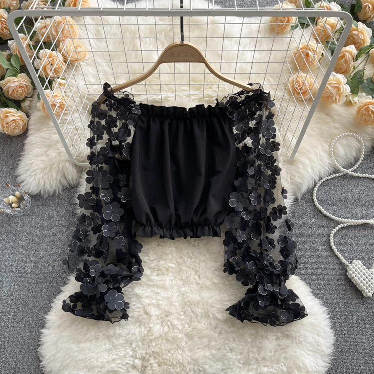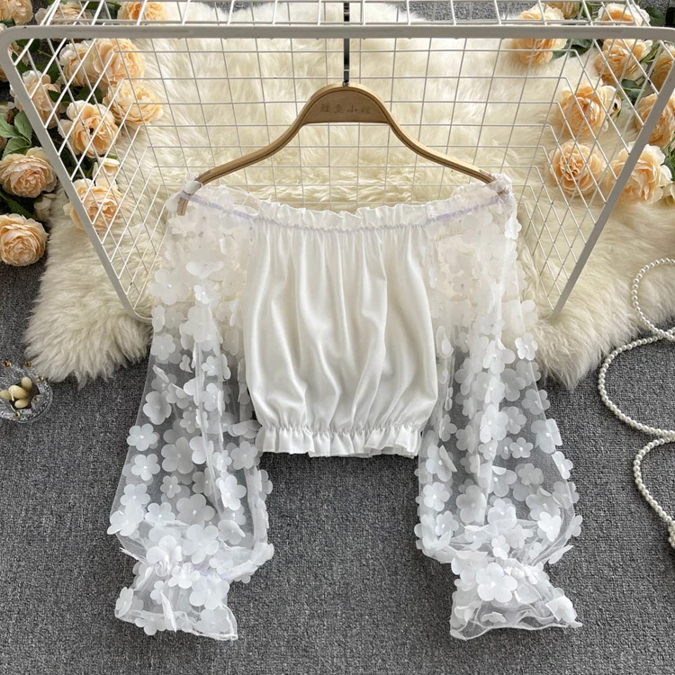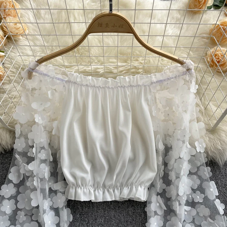 Повседневные белые сетчатые топы с оборками и цветочным принтом; Весенняя женская короткая рубашка; Блузка для девочек; Женская блузка с пышными длинными рукавами; Женские тонкие блузки; Новинка