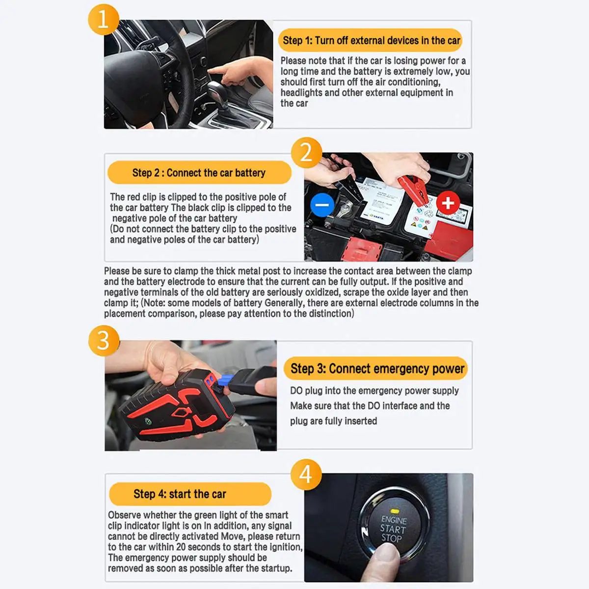-Не нужно устанавливать и устанавливать, просто используйте зажим для подключения автомобиля положительным и отрицательным.