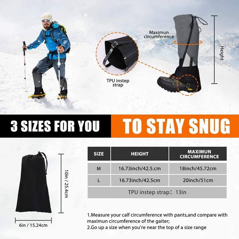 Усовершенствованная Водонепроницаемая застежка-молния и ТПУ-лучше, чем обычные гетры для ботинок с пряжкой, которые легче получить грязь и не выдерживают длительного использования, наши гетры изготовлены из прочной водонепроницаемой молнии, которые обеспечивают вам гораздо больше удобства и долговечности. Модернизированные усиленные ремешки с низким умеренным сопротивлением, отлично работают на льду и скале, не ломаются, и могут быть легко отрегулированы, чтобы гарантировать, что охотничьи гетры подходят к вашей обуви.