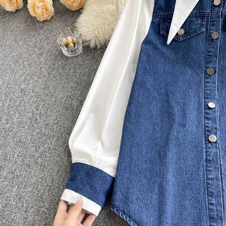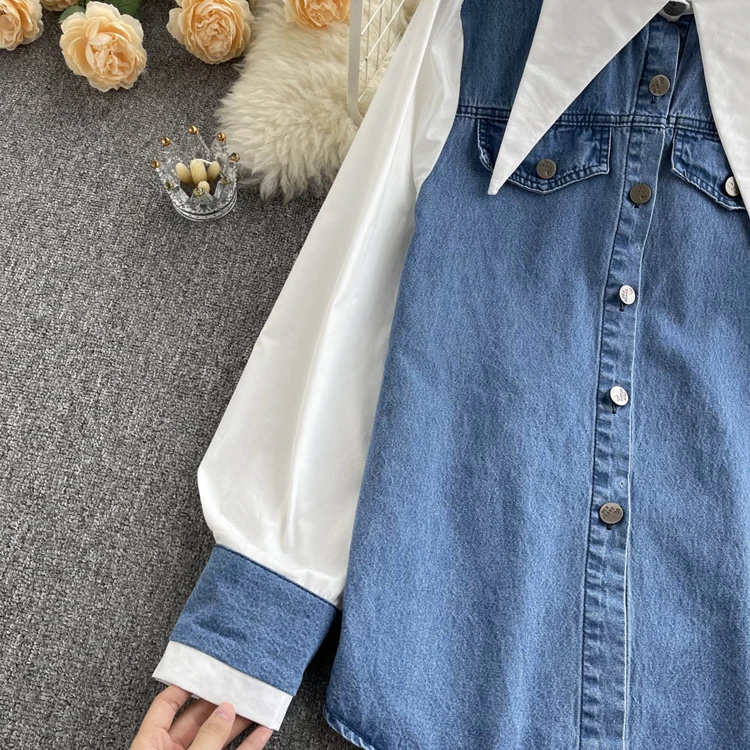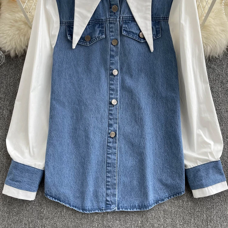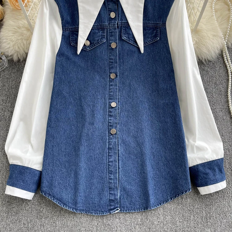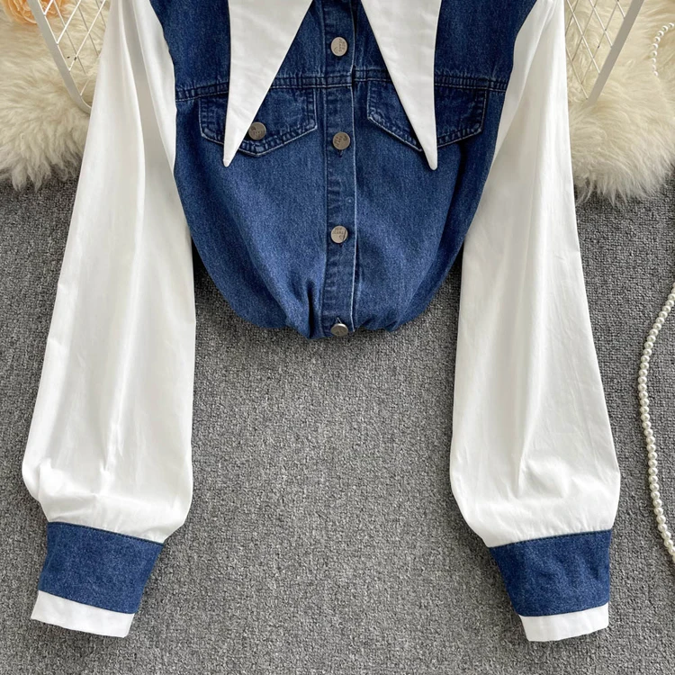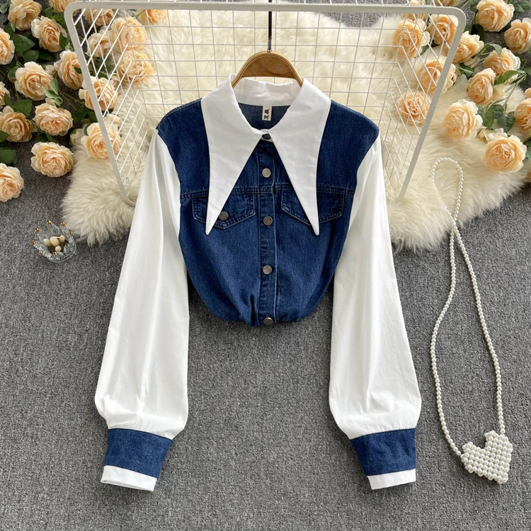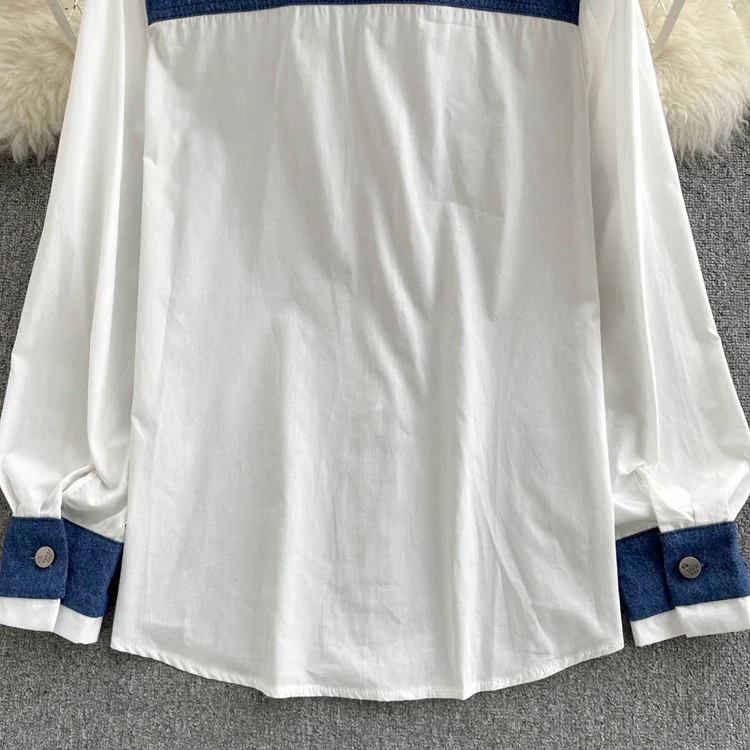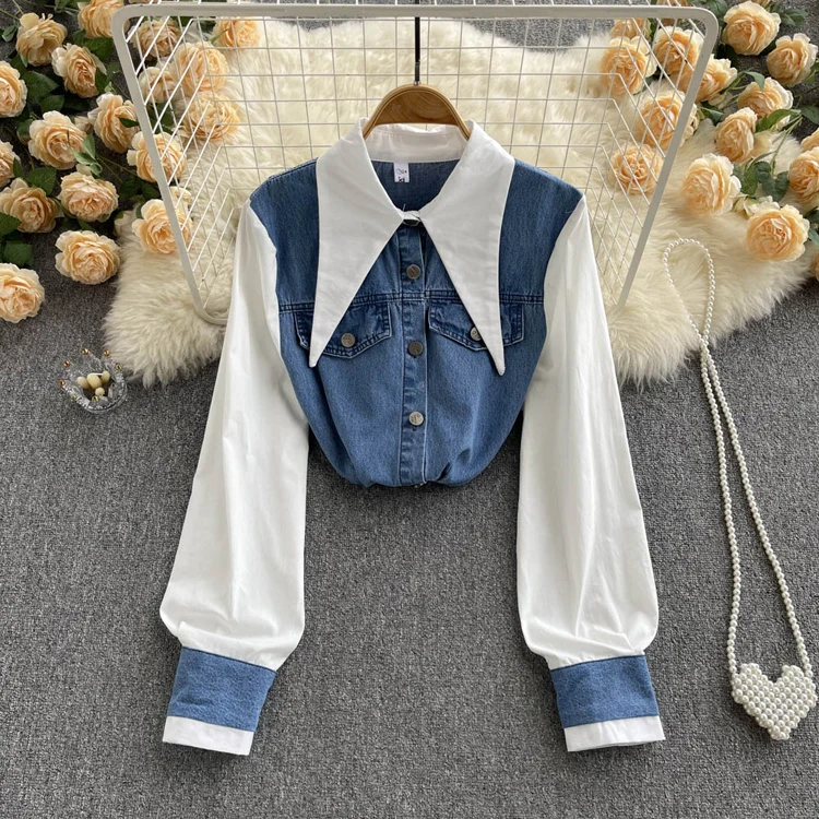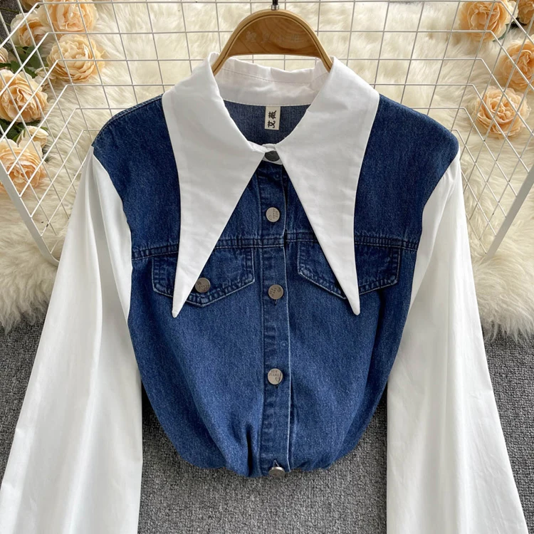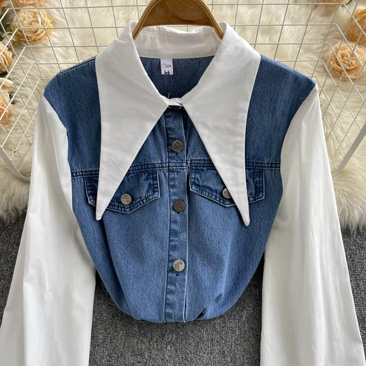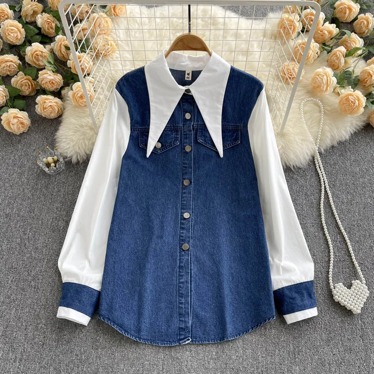 2022 Весенне-осенняя женская синяя джинсовая рубашка, контрастная лоскутная свободная блузка, тонкие универсальные верхние