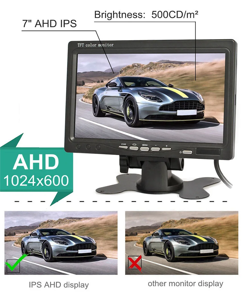Экран AHD 7 "с разрешением 1024x600, сУстановка кронштейна. Взять с собой два 4-контактный/RCA видео вход переменного тока, может работать сКамеры заднего вида AHDИКамеры наблюдения AHD.