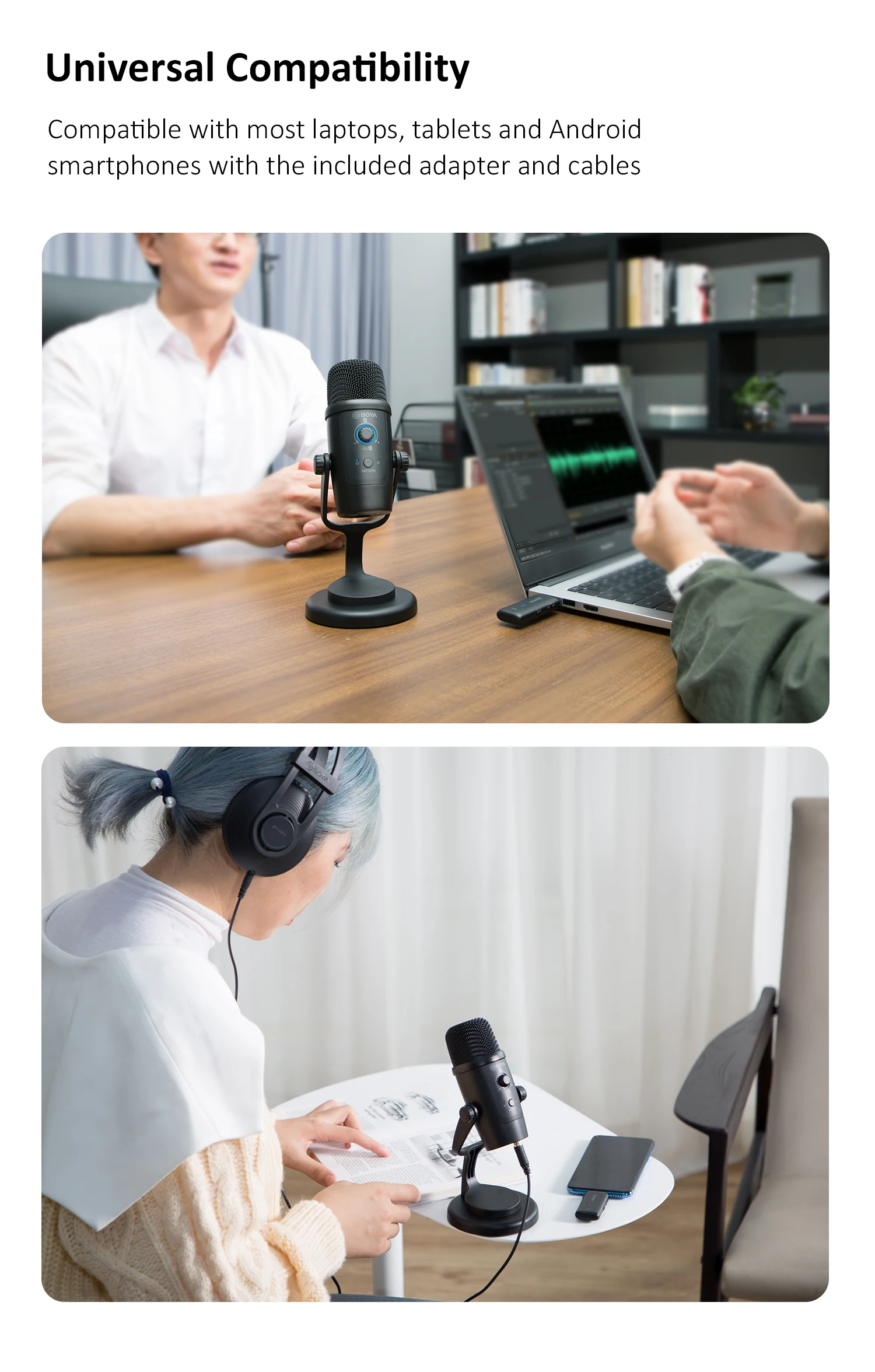 BY-PM500W включает в себя USB-A-адаптер и USB-C выходные кабели, что позволяет легко подключать и воспроизводить функциональность со всеми типами компьютеров с USB или USB-C, а также Android смартфонов и планшетов, А также iPad Pro и iPad Air с USB-C. Пользователи также могут легко адаптировать его к iPhone и iPad с USB-C к кабелю Apple Lightning (продается отдельно).