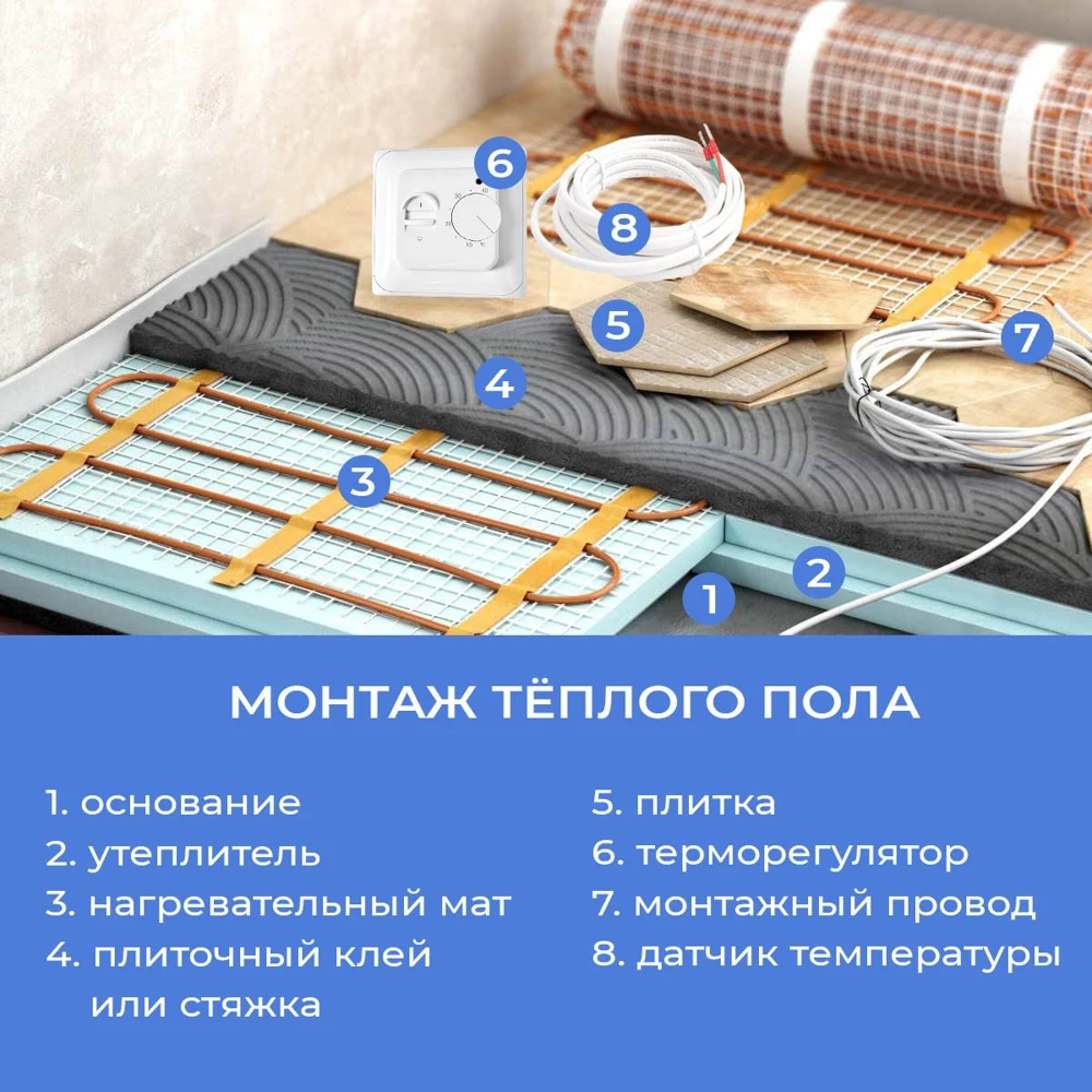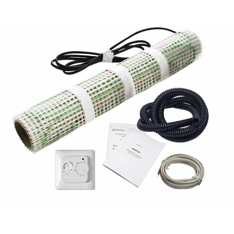 Нагревательный мат от компании Манотек - это:готовый для монтажа продукт (в комплект входят: нагревательный мат заявленной квадратуры, терморегулятор, датчик температуры, гофратрубка для терморегулятора, руководство по установке и эксплуатации);сетка на клеевой основе;двухжильный кабель - увеличивает нагревательную мощность системы. По сравнению с одножильным кабелем двухжильные теплые полы более энергоемкие и проще в установке, замыкание цепи происходит на окончании кабеля - контакты просто соединяются друг с другом.простой монтаж - достаточно лишь разложить маты, установить датчик температуры и покрыть их плиточным клеем или цементной стяжкой.сетку можно резать на фрагменты, не нарушая при этом целостности кабеля, что позволяет легко разложить маты на площади любой конфигурации.