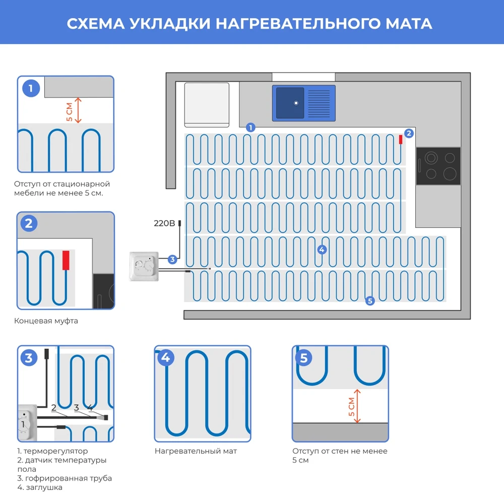 Теплый пол доступен в виде предварительно сконфигурированного мата с напряжением 220 В.