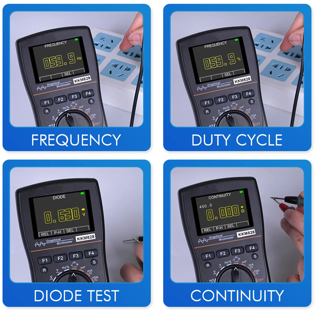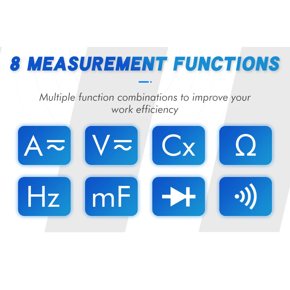 Функции измерения мультиметра: переменное/постоянное напряжение, переменный/постоянный ток, сопротивление, емкость, частота, рабочий цикл, проверка диодов, проверка целостности цепи.