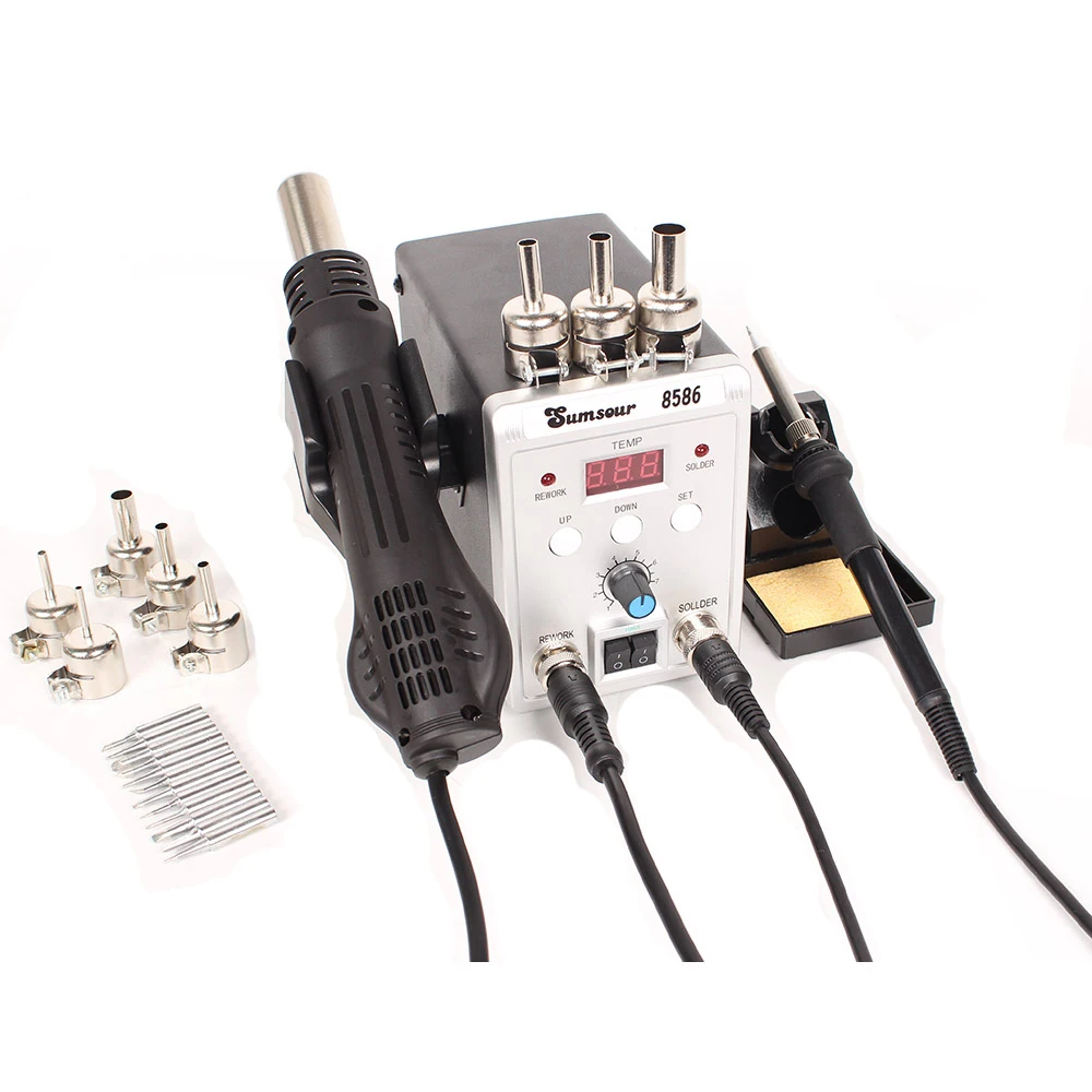 Это совершенно новая паяльная станция 2 в 1 SMD 8586. Металлический корпус из сплава с высококачественным силиконовым корпусом отличается элегантным внешним видом и энергосбережением. Вы можете использовать пистолет горячего воздуха и паяльник отдельно, без помех друг с другом.