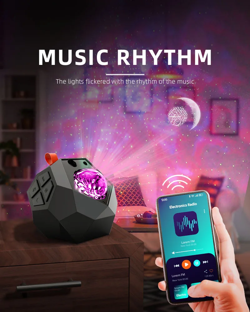 4. Пульт дистанционного управления может регулировать цветовое соответствие, цвет морской волны/Авроры, скорость морской волны/Авроры, туманность, лазер, регулировка яркости Луны, изменение режима Корана, мусульманский режим MP3 песни и режим Bluetooth, выключатель питания.