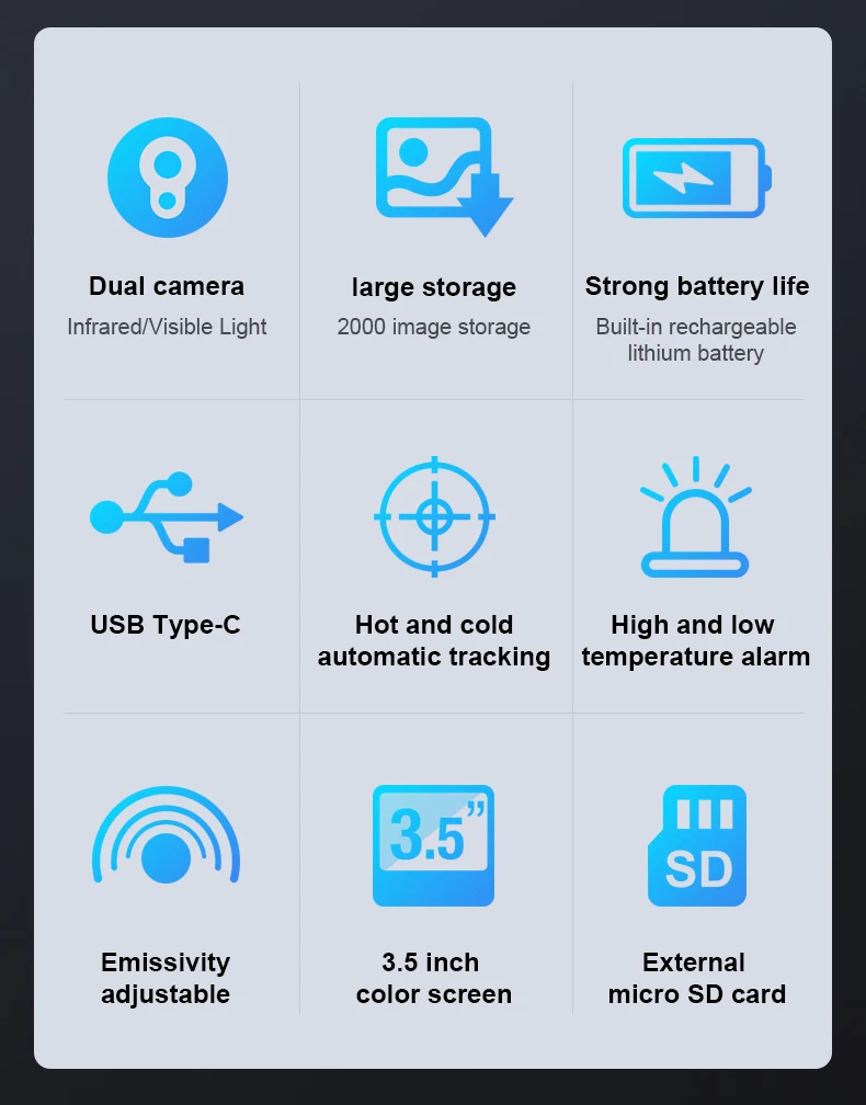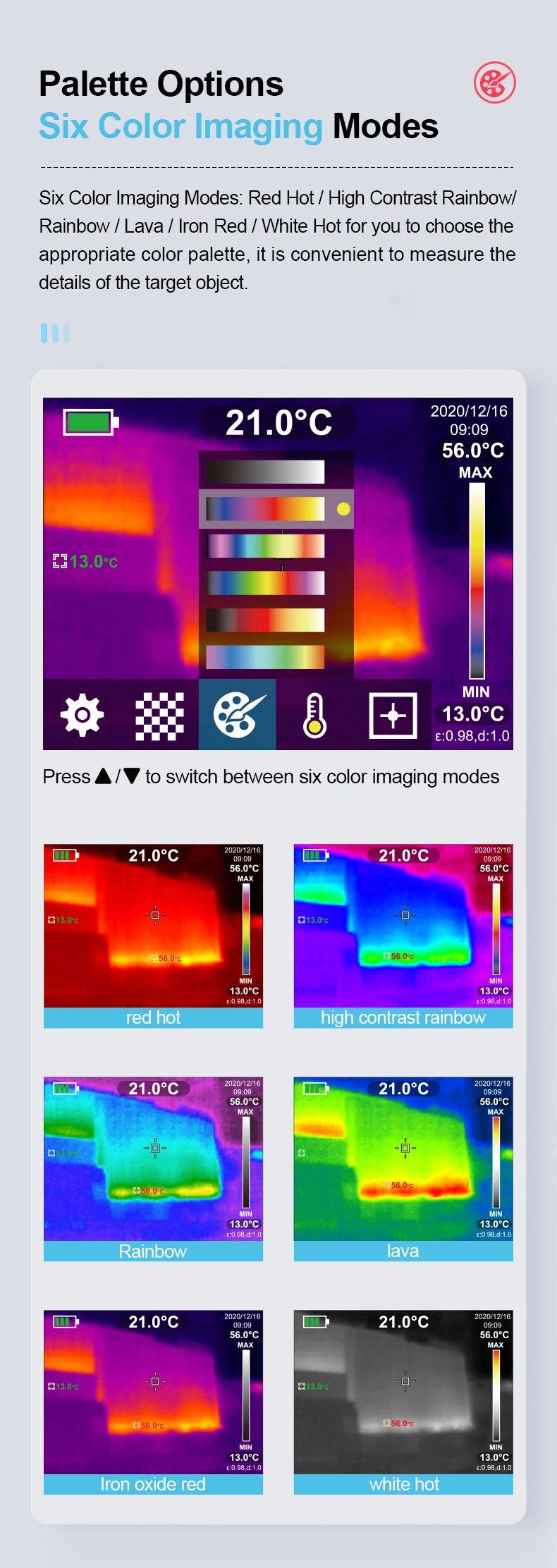 Шесть цветовых режимов изображения: красный, ярко-/высококонтрастный, Радужный/дождевой/Лаваль/Железный, красный/белый, горячий для вас, чтобы выбрать подходящую цветовую палитру, удобно измерять детали целевого объекта.
