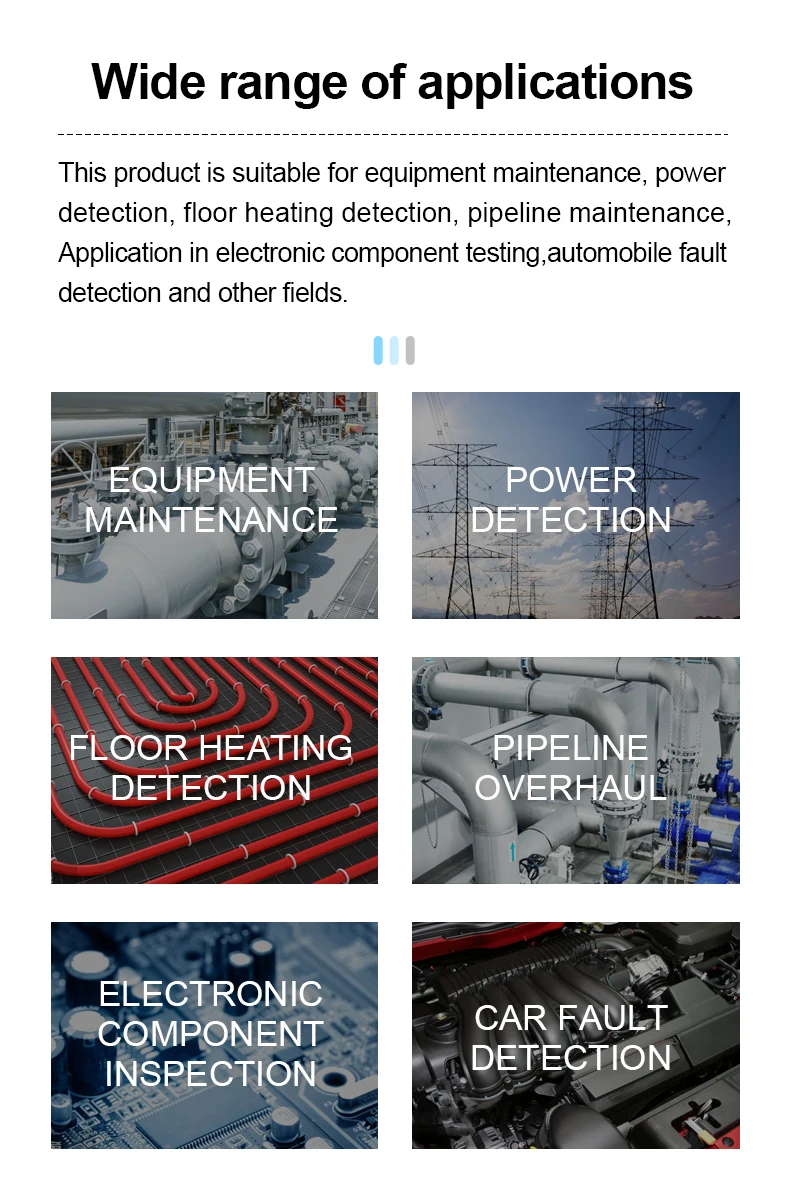 Этот продукт подходит для технического обслуживания оборудования, обнаружения мощности, обнаружения нагрева пола, обслуживания трубопроводов, применения в тестировании электронных компонентов, обнаружения автомобильной неисправности и других областях.