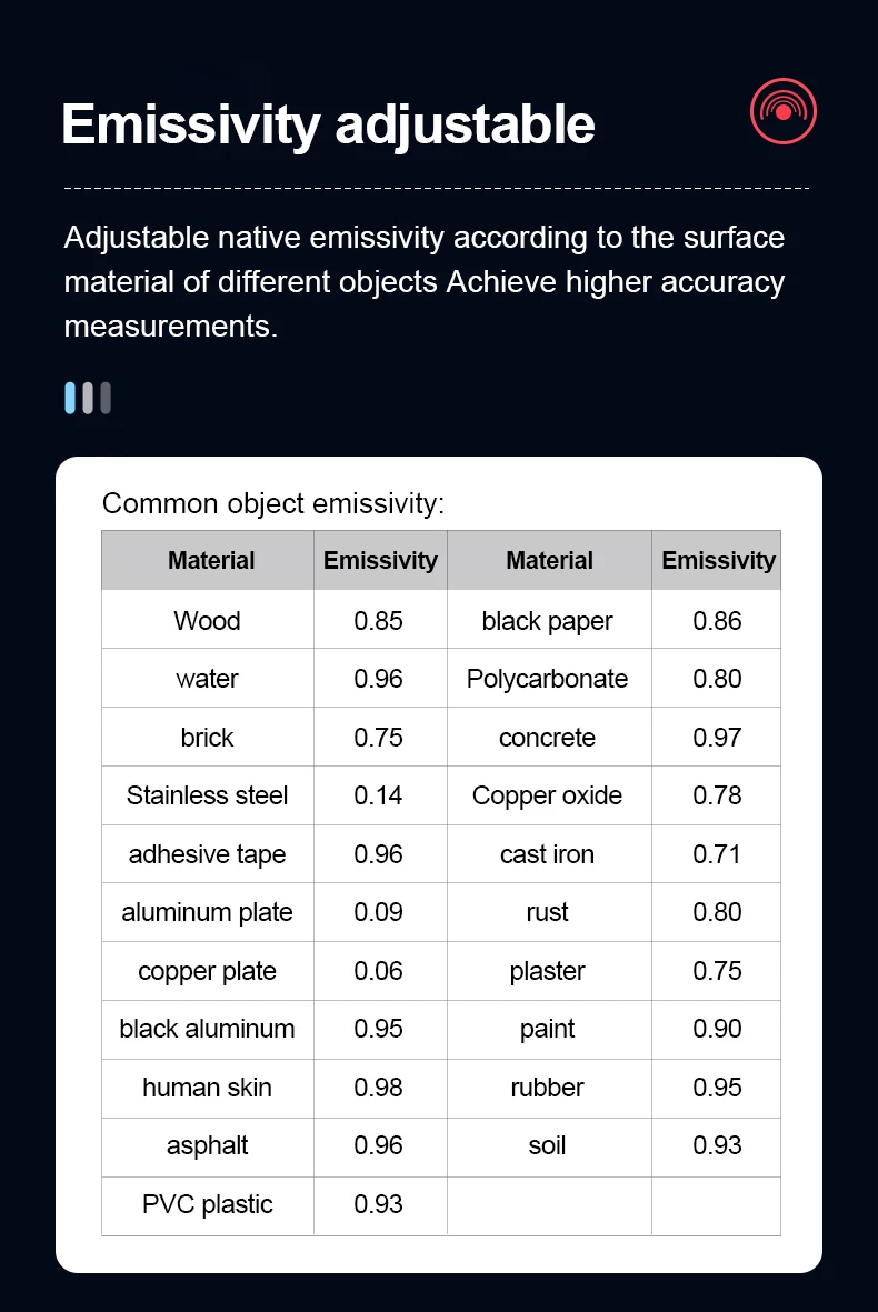 Регулируемая собственная излучательная способность в соответствии с поверхностным материалом различных объектов обеспечивает более высокую точность измерений.