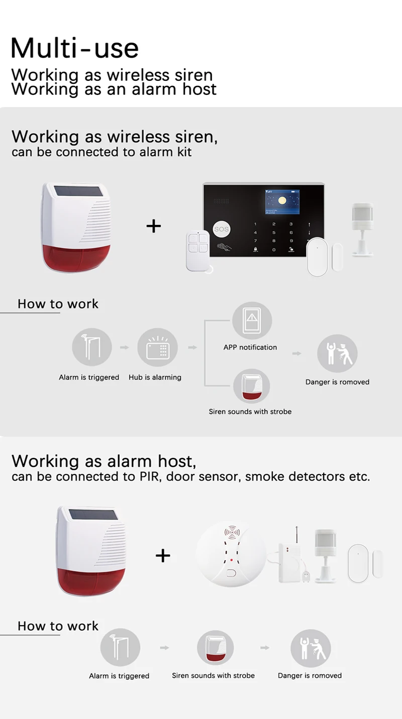Когда Сирена звучит, она может достигать 110 дБ, и она будет сопровождать мигающий красный светильник, который может эффективно удерживать воров.