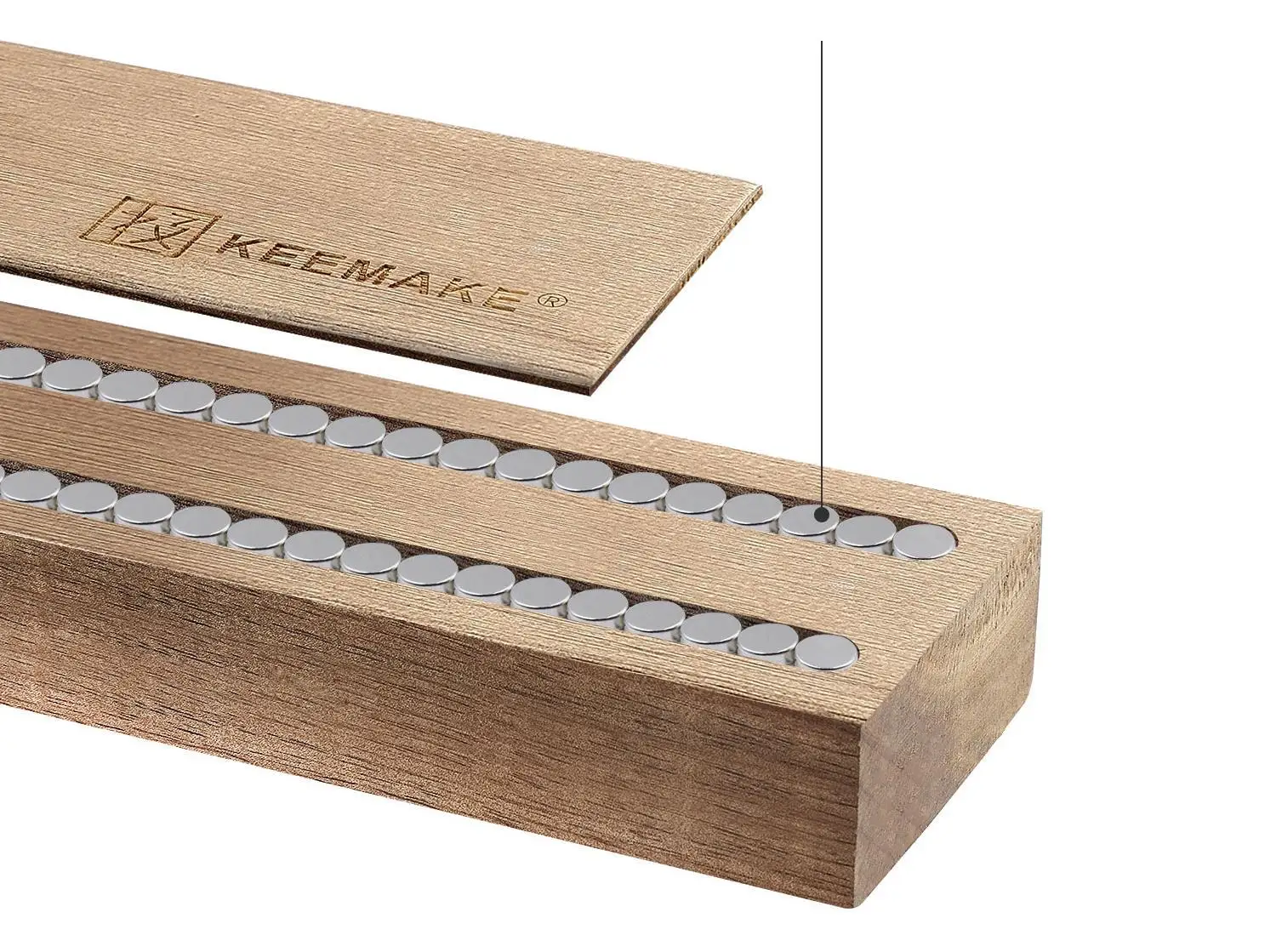 В отличие от обычных ферритовых магнитов держатель ленты ножа, keemake 16 ''магнитная лента для ножей, встроенная с 2 рядами сильных неодимовых круглых магнитов, проходящих по всей полосе, которая получает более 900 Гаусс магнитной силы, чтобы надежно удерживать большинство ножей и ферромагнитных объектов, но достаточно весит светильник.