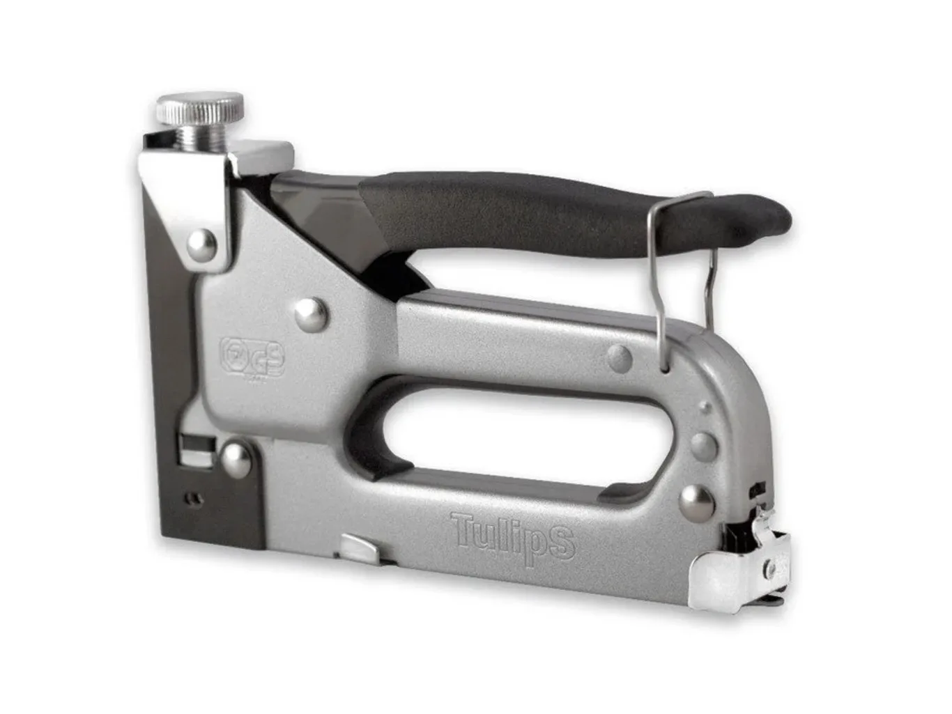 Степлер TULIPS TOOLS артикул IP11-906 + набор скоб, механический для П-образных скоб типов 53 (6-14 мм) с регулировкой силы удара в прочном литом металлическом корпусе. Имеет механизм, обеспечивающий быстрое устранение заевших скоб. Обрезиненная рукоятка фиксируется замком в крайнем нижнем положении для удобства хранения.