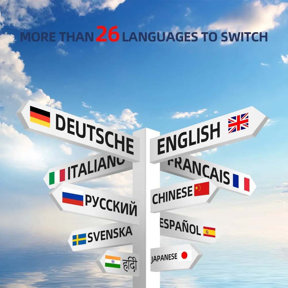 Он имеет 26 различных языков, таких как английский, французский, испанский, русский, корейский, японский, арабский, португальский и т. Д.