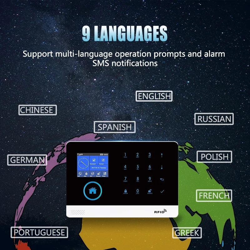 Хост сигнализации * 1 + инфракрасный детектор движения * 5 + датчик двери * 9 + пульт дистанционного управления * 3 + Проводная сирена * 1 + RFID карта * 3