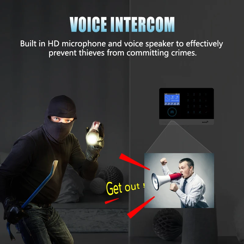 Если воры вторгаются, система сигнализации оповещает окружающих и задерживает потенциальных нарушителей, хост будет звучать и отправлять SMS/звонки на ваш предустановленный номер телефона. Вы получите уведомление в первый раз