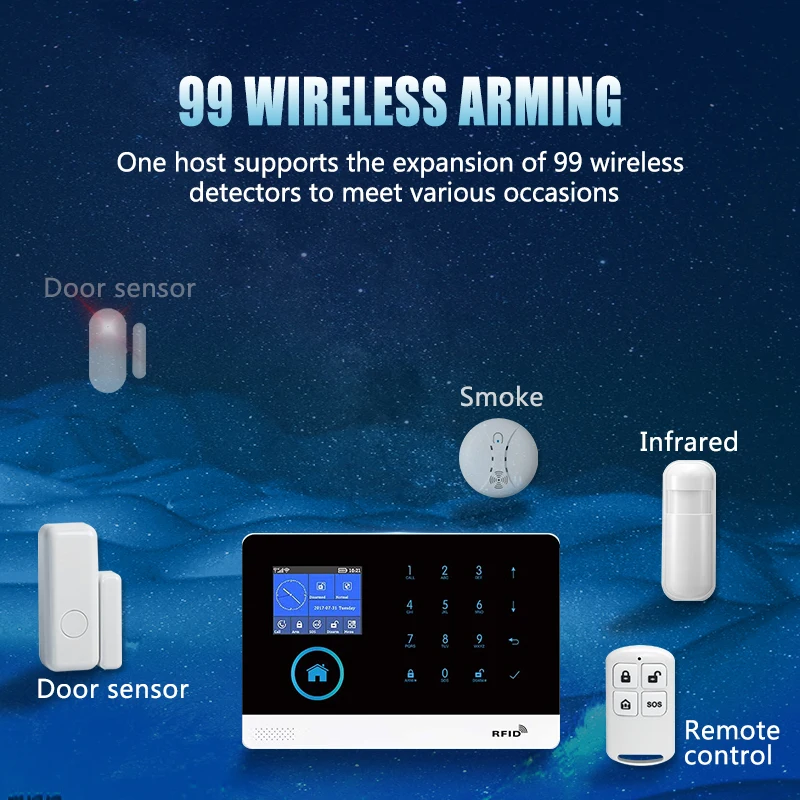 Хост сигнализации * 1 + инфракрасный детектор движения * 5 + датчик двери * 10 + пульт дистанционного управления * 3 + Проводная сирена * 1 + RFID карта * 3