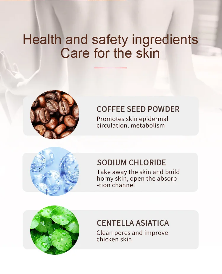 1. Contains caffeine, which promotes fat breakdown and fat burning. In addition, massage can increase blood circulation, and the friction between coffee beans and skin can make skin firmer and reduce cellulite.