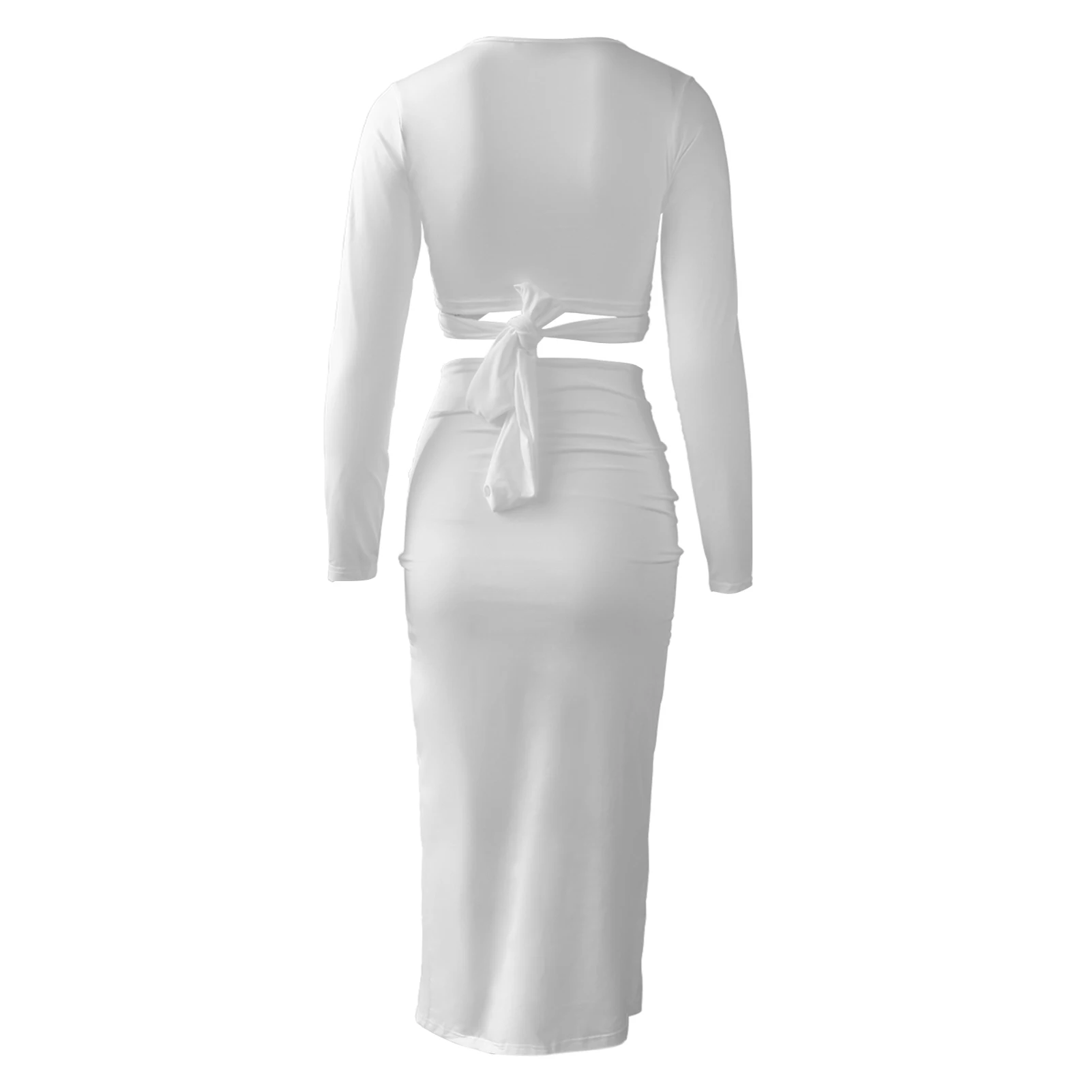 Сексуальный облегающий комплект из топа и юбки для вечеринок и клубов. Укороченная футболка с глубоким v-образным вырезом, скрученным передом и самозавязывающимся краем, юбка с высоким разрезом и сборками подчеркивает подчеркивающие фигуру изгибы. Сочетайте обувь на высоком каблуке для жаркой ночи.