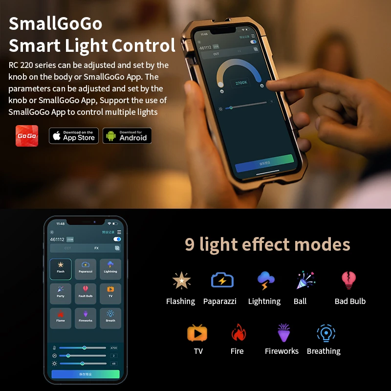 3. Поддерживает ручной светильник и пульт дистанционного управления с приложением SmallGoGo. Интеллигентая (ый) светильник контролировать предлагает Регулировка цветовой температуры и 9 светильник эффекты;