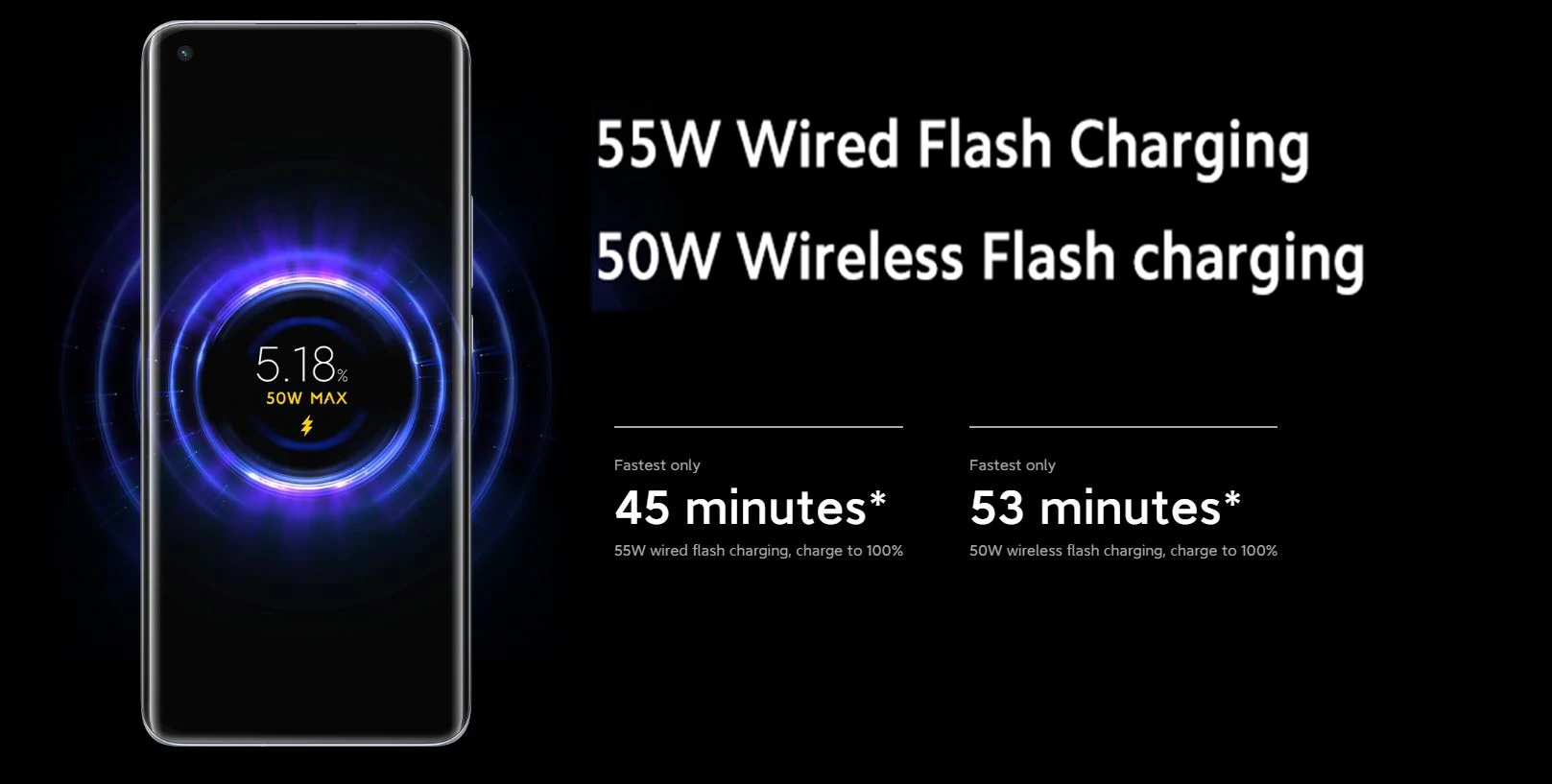 55 Вт Проводная зарядка 50 Вт Беспроводная зарядка 10 Вт Беспроводная обратная зарядка