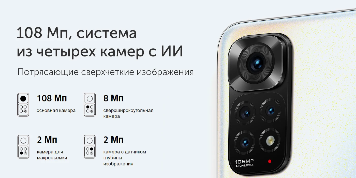 108Mп широкоугольная (Samsung HM2) + 8Мп сверхширокоугольная (Угол обзора 118°) + 2Мп макрокамера + 2 Мп камера глубины