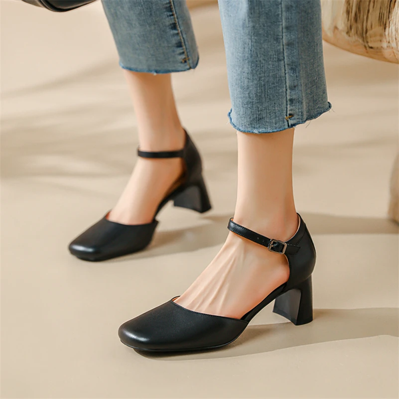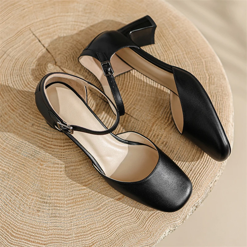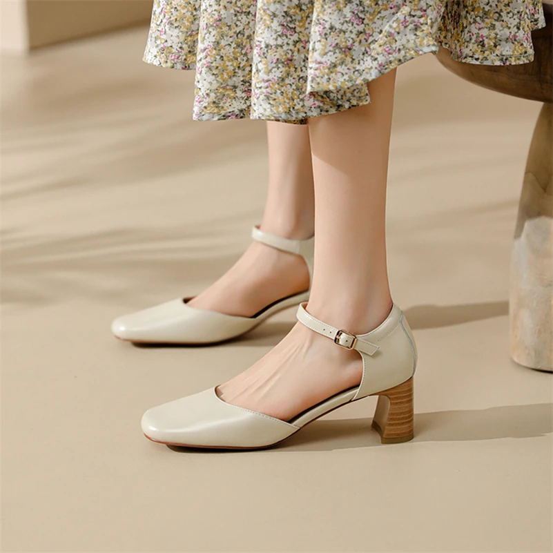 Meotina/Женская обувь с ремешком на щиколотке; Туфли-лодочки из натуральной кожи на толстом каблуке с квадратным носком на высоком каблуке с пряжкой; Женская обувь; Сезон весна; Цвет бежевый, черный
