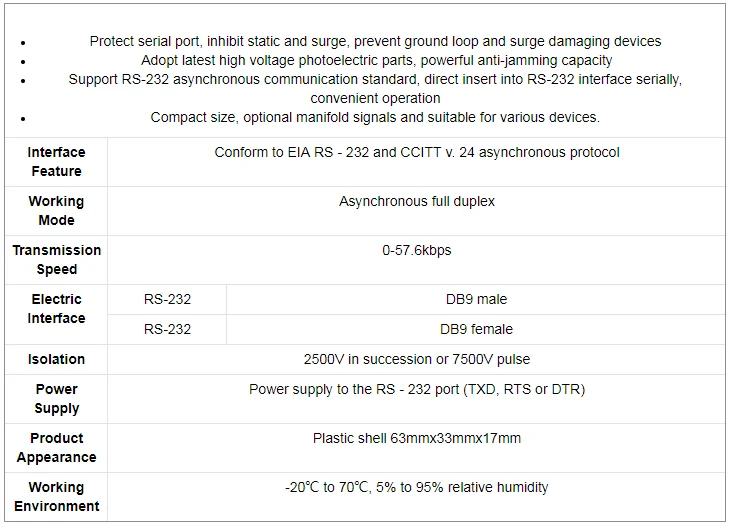ATC-131 оптически изолирует и защищает линии передачи и приема вашего порта RS-232 от заземляющих петель и скачков мощности до 2500 В RMS в течение одной минуты. Поток данных преобразуется из электрического импульса в оптический луч, затем обратно в электрический импульс. Потому что нет электрического соединения между DTE и DCE сторонами изолятора, ATC-131, в отличие от перенапряжения, не будет проходить большие устойчивые скачки энергии через ваше оборудование.