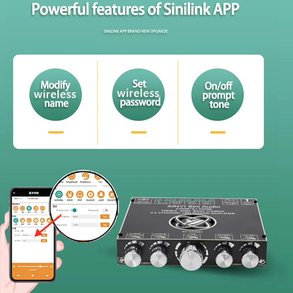 XY-S350H управление приложением 220Wx2 + 350 Вт усилитель плата TPA3251D2 2,1 двухканальный Bluetooth-совместимый 5,1 + AUX + USB звуковая карта + USB флэш-диск сабвуфер модуль аудио стерео беспроводной HiFi модулятор Характеристика: 1. Оригинальная импортная схема чипа усилителя мощности TPA3251D2: TPA3251D2 является высокопроизводительным усилителем мощности класса D, который имеет эффективность класса D и может принести Настоящее высококачественное качество звука. Устройство имеет расширенные интегрированные Отзывы и собственную высокоскоростную коррекцию ошибок драйвера ворот (pure path TM HD). Эта технология позволяет устройству поддерживать Ультра-низкие искажения во всем диапазоне частот аудио и одновременно показывать высокое качество звука. 2. Bluetooth-совместимый 5.1 модуль усилителя мощности звука: 2,1 двухканальный стерео выход, выходная мощность 220 Вт * 2 (левый и правый каналы) + 350 Вт (сабвуфер), чистое HiFi Качество звука. Высокие частоты чистые и прозрачные, средние частоты нежные и деликатные, а басы резкие и шокирующие. 3. Классический внешний вид многофункциональная основная Ручка: основная ручка принимает Поворотный энкодер, используемый только в высококлассном усилителе мощности для реализации бесступенчатой настройки на 360 градусов. Он чувствует себя гладким, запуск и остановка одной кнопки, длительное нажатие, чтобы начать и остановить, и операция проста и удобна. 4. Поддержка управления мобильным приложением: новое обновление приложения Sini link; Поддержка изменения имени, совместимого с Bluetooth; Установка пароля, совместимого с Bluetooth; Включение/выключение 5. Поддержка аудиовхода ed: совместимость с Bluetooth 5,1, AUX, звуковая карта USB, флэш-диск USB (файловая система USB флэш-диска должна быть полной 32, а максимальная поддержка-32 ГБ) 6. Механизм рассеивания тепла: теплоотвод + вентилятор для рассеивания тепла, безопасно и без беспокойства. Теплоотвод из алюминиевого сплава с специальной структурой и поддержкой вентилятора используется для снижения температуры и эффективного обеспечения полной мощности продукта