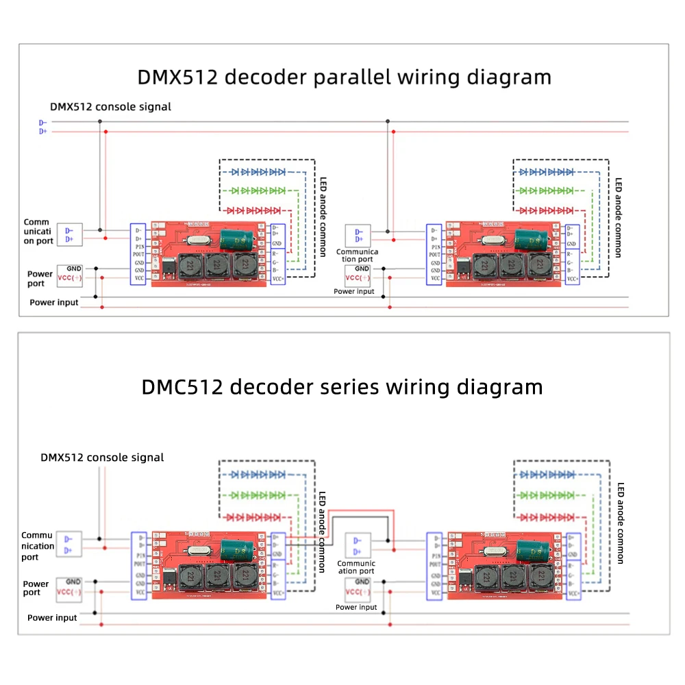 Когда контроллер DMX512 подключен, он изменится в соответствии с эффектом контроллера. Когда контроллер DMX512 не подключен, встроенные эффекты (скачок цвета, градиент) будут автоматически работать; В последовательном режиме, когда основной контроллер не подключен, первый декодер может автоматически стать мастером для достижения синхронных онлайн-изменений;